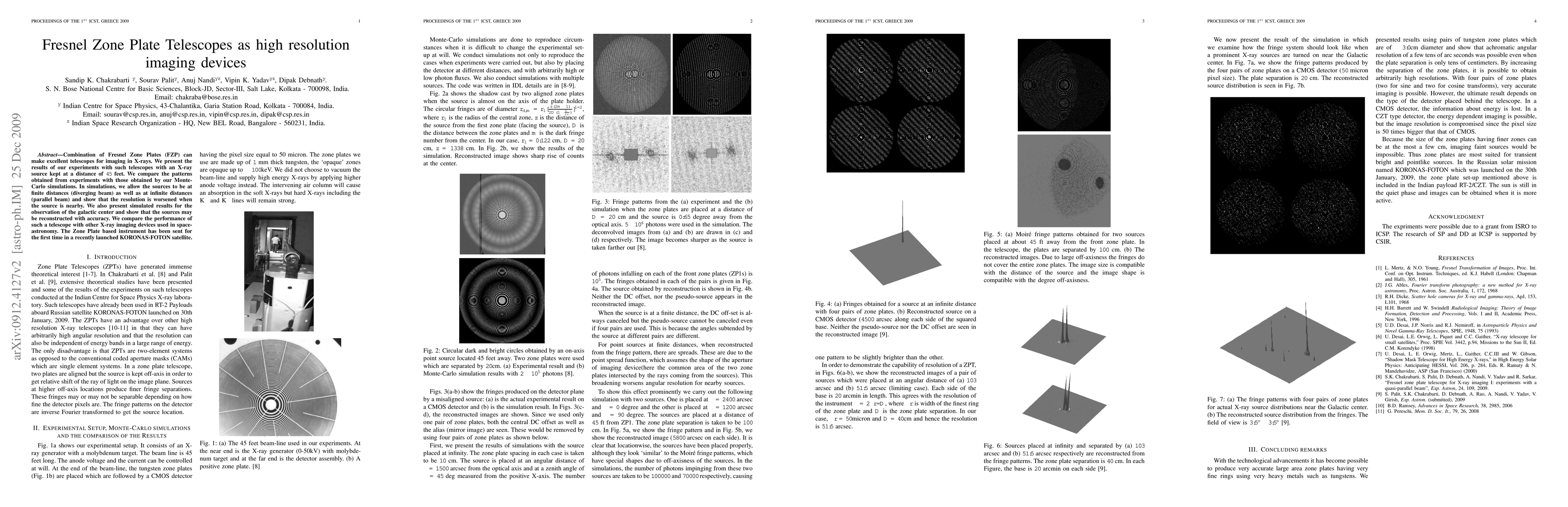 Combination of Fresnel Zone Plates (FZP) can make excellent telescopes for imaging in X-rays. We present the results of our experiments with such telescopes with an X-ray source kept at a distance of 45 feet. We compare the patterns obtained from experiments with those obtained by our Monte-Carlo simulations. In simulations, we allow the sources to be at finite distances (diverging beam) as well as at infinite distances (parallel beam) and show that the resolution is worsened when the source is nearby. We also present simulated results for the observation of the galactic center and show that the sources may be reconstructed with accuracy. We compare the performance of such a telescope with other X-ray imaging devices used in space-astronomy. The Zone Plate based instrument has been sent for the first time in a recently launched KORONAS-FOTON satellite.