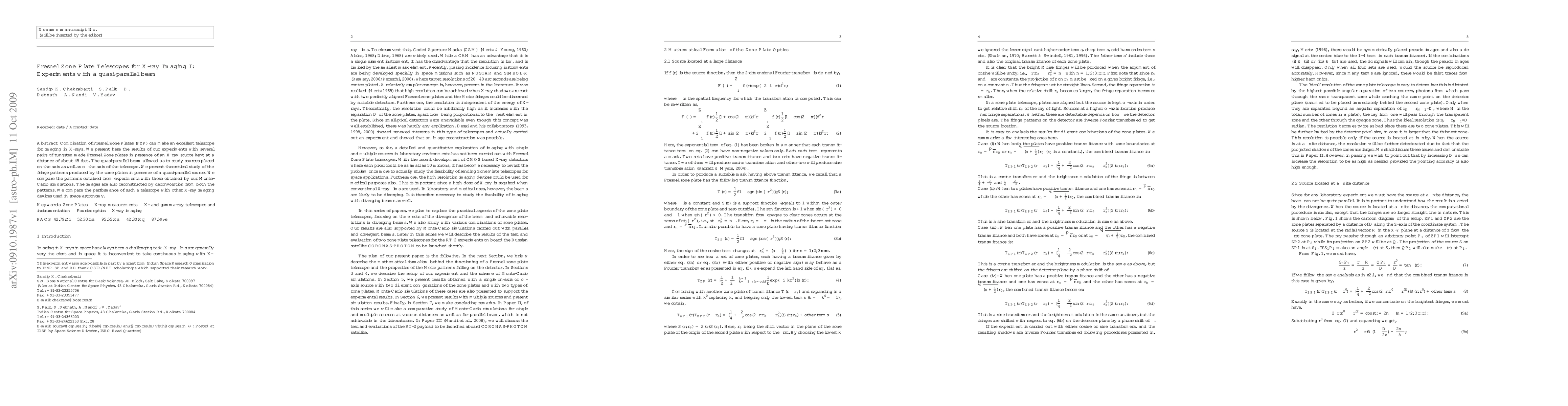 This paper reports on experiments using Fresnel Zone Plates (FZP) for X-ray imaging, employing tungsten-made zone plates and a quasi-parallel beam. The study compares experimental fringe patterns with Monte-Carlo simulations and reconstructs images via deconvolution, evaluating the performance against other X-ray imaging devices in space-astronomy.