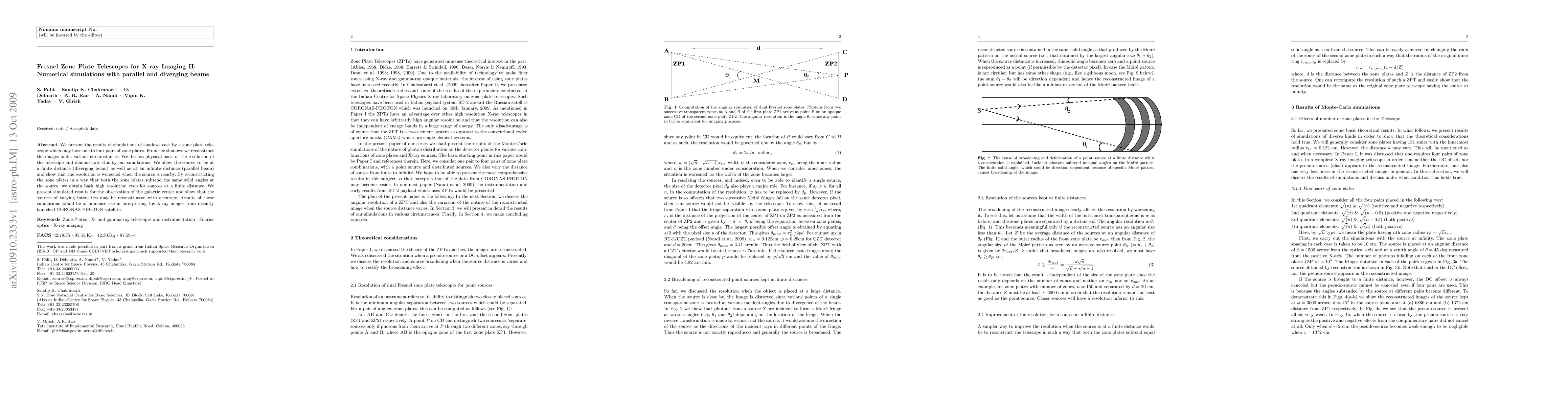 We present the results of simulations of shadows cast by a zone plate telescope which may have one to four pairs of zone plates. From the shadows we reconstruct the images under various circumstances. We discuss physical basis of the resolution of the telescope and demonstrate this by our simulations. We allow the source to be at a finite distance (diverging beam) as well as at an infinite distance (parallel beam) and show that the resolution is worsened when the source is nearby. By reconstructing the zone plates in a way that both the zone plates subtend the same solid angles at the source, we obtain back high resolution even for sources at a finite distance. We present simulated results for the observation of the galactic center and show that the sources of varying intensities may be reconstructed with accuracy. Results of these simulations would be of immense use in interpreting the X-ray images from recently launched CORONAS-PHOTON satellite.