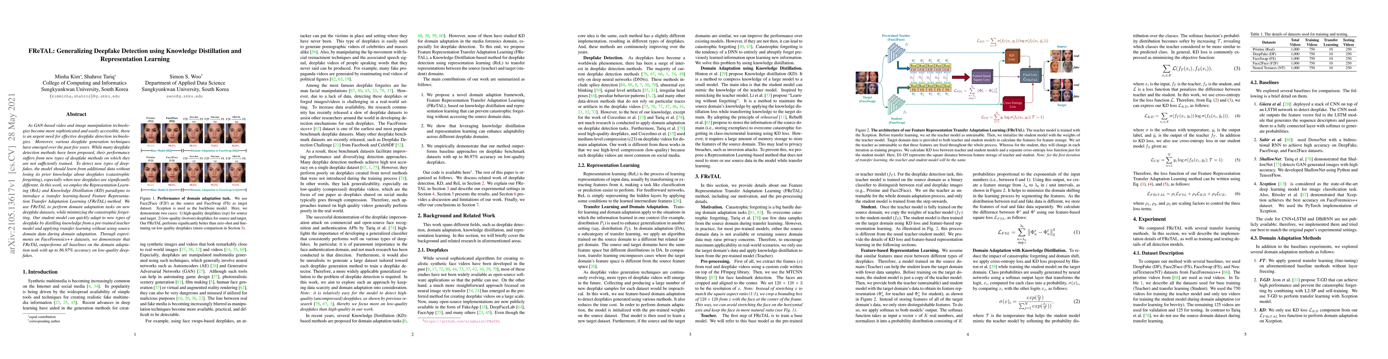 The paper proposes FReTAL, a method combining Representation Learning and Knowledge Distillation to generalize deepfake detection across new types of deepfakes. FReTAL minimizes catastrophic forgetting through transfer learning, achieving up to 86.97% accuracy on low-quality deepfakes in FaceForensics++ datasets.
