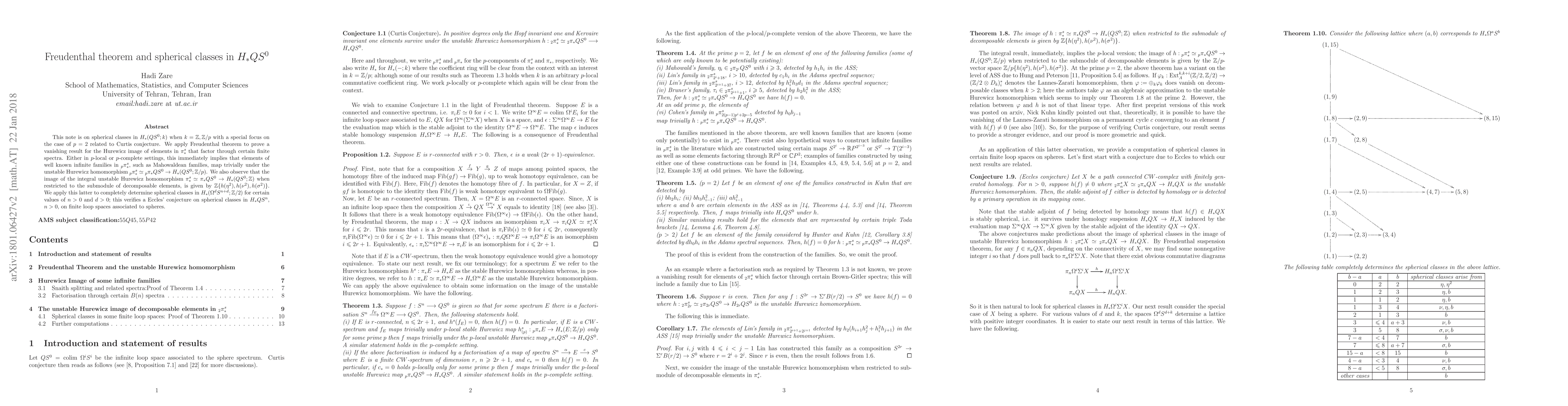 This note is on spherical classes in $H_*(QS^0;k)$ when $k=\mathbb{Z},\mathbb{Z}/p$ with a special focus on the case of $p=2$ related to Curtis conjecture. We apply Freudenthal theorem to prove a vanishing result for the Hurewicz image of elements in ${\pi_*^s}$ that factor through certain finite spectra. Either in $p$-local or $p$-complete settings, this immediately implies that elements of well known infinite families in ${_p\pi_*^s}$, such as Mahowaldean families, map trivially under the unstable Hurewicz homomorphism ${_p\pi_*^s}\simeq{_p\pi_*}QS^0\to H_*(QS^0;\mathbb{Z}/p)$. We also observe that the image of the integral unstable Hurewicz homomorphism $\pi_*^s\simeq\pi_*QS^0\to H_*(QS^0;\mathbb{Z})$ when restricted to the submodule of decomposable elements, is given by $\mathbb{Z}\{h(\eta^2),h(\nu^2),h(\sigma^2)\}$. We apply this latter to completely determine spherical classes in $H_*(\Omega^dS^{n+d};\mathbb{Z}/2)$ for certain values of $n>0$ and $d>0$; this verifies a Eccles' conjecture on spherical classes in $H_*QS^n$, $n>0$, on finite loop spaces associated to spheres.