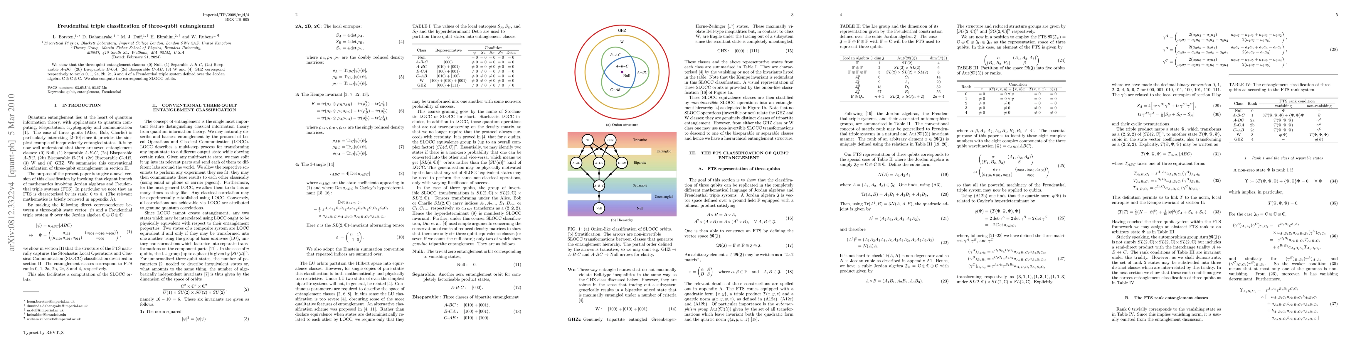 This paper classifies three-qubit entanglement into six classes using Freudenthal triples from the Jordan algebra C+C+C, mapping them to ranks 0 through 4, and computes the SLOCC (Stochastic Local Operation and Classical Communication) orbits for each class.