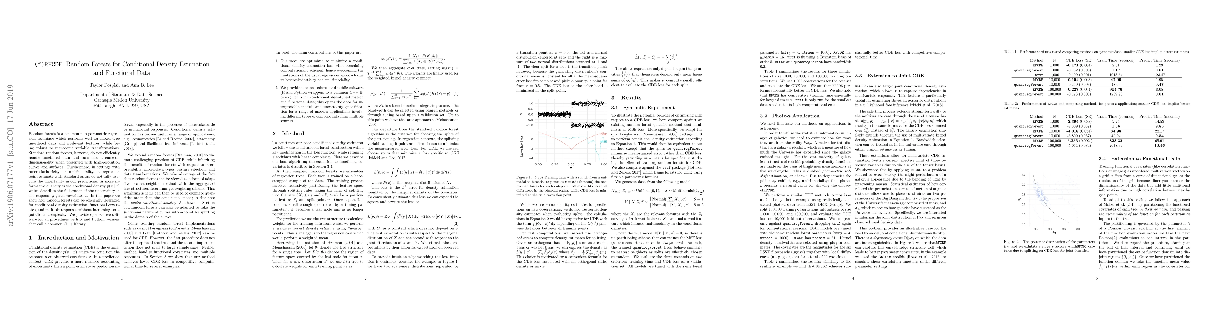 This paper introduces (f)RFCDE, a method that leverages random forests for efficient conditional density estimation and handling of functional data, addressing the curse of dimensionality and capturing uncertainty through full density estimation rather than point estimates. The approach is implemented in open-source software available in R and Python.