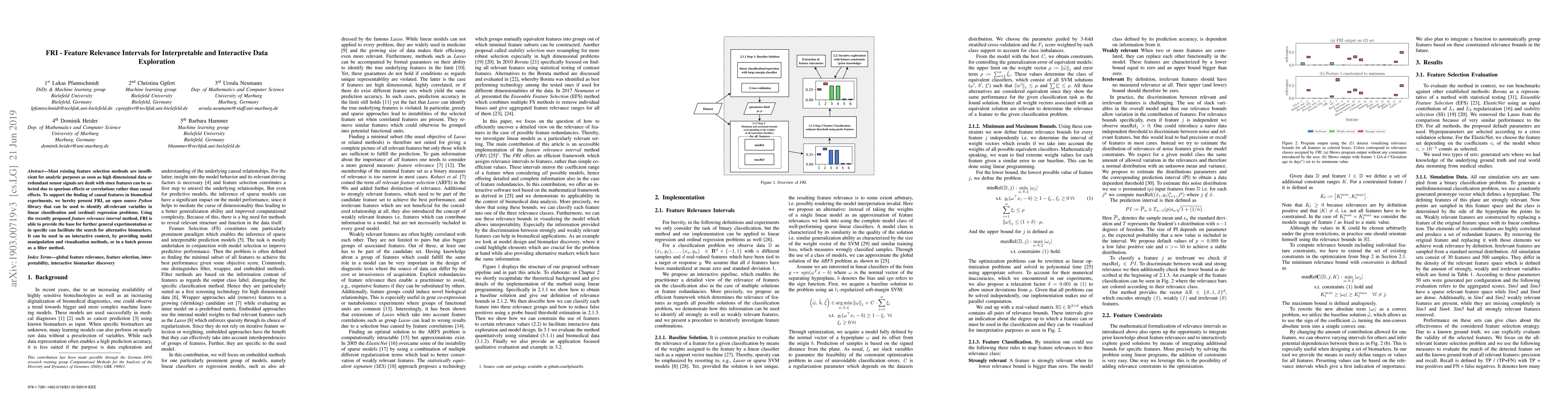 Most existing feature selection methods are insufficient for analytic purposes as soon as high dimensional data or redundant sensor signals are dealt with since features can be selected due to spurious effects or correlations rather than causal effects. To support the finding of causal features in biomedical experiments, we hereby present FRI, an open source Python library that can be used to identify all-relevant variables in linear classification and (ordinal) regression problems. Using the recently proposed feature relevance method, FRI is able to provide the base for further general experimentation or in specific can facilitate the search for alternative biomarkers. It can be used in an interactive context, by providing model manipulation and visualization methods, or in a batch process as a filter method.