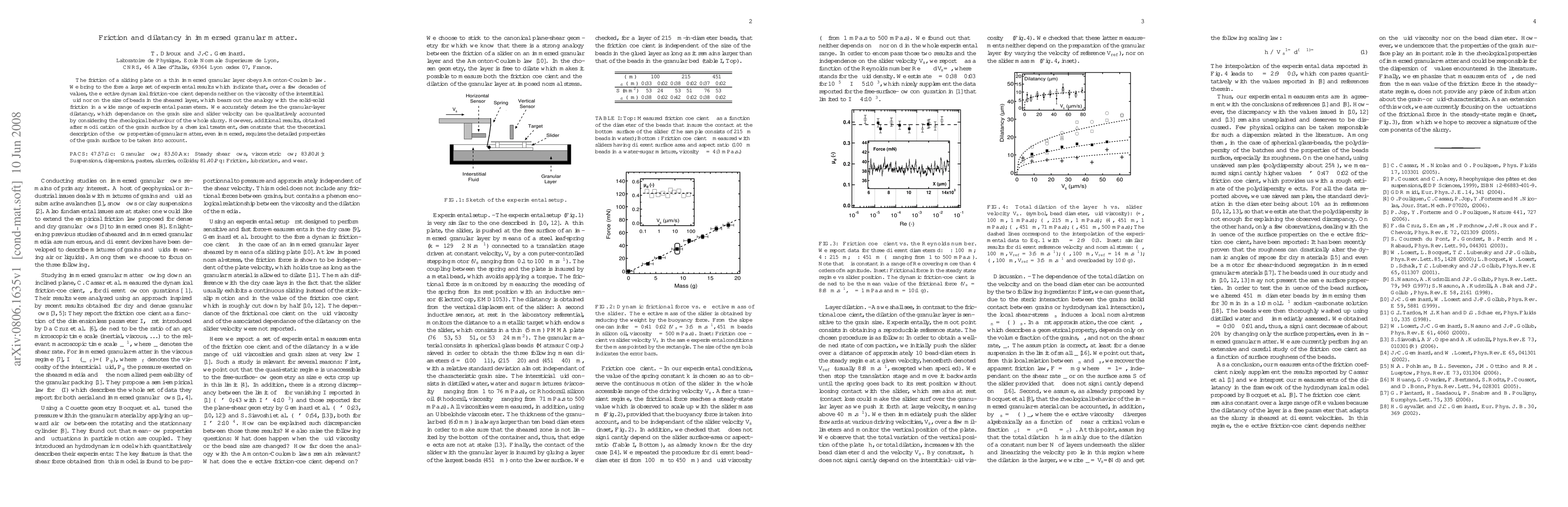 The paper presents detailed experimental results demonstrating the independence of dynamical friction coefficient from fluid viscosity and bead size, as well as the dependence of granular layer dilatancy on grain size and slider velocity.