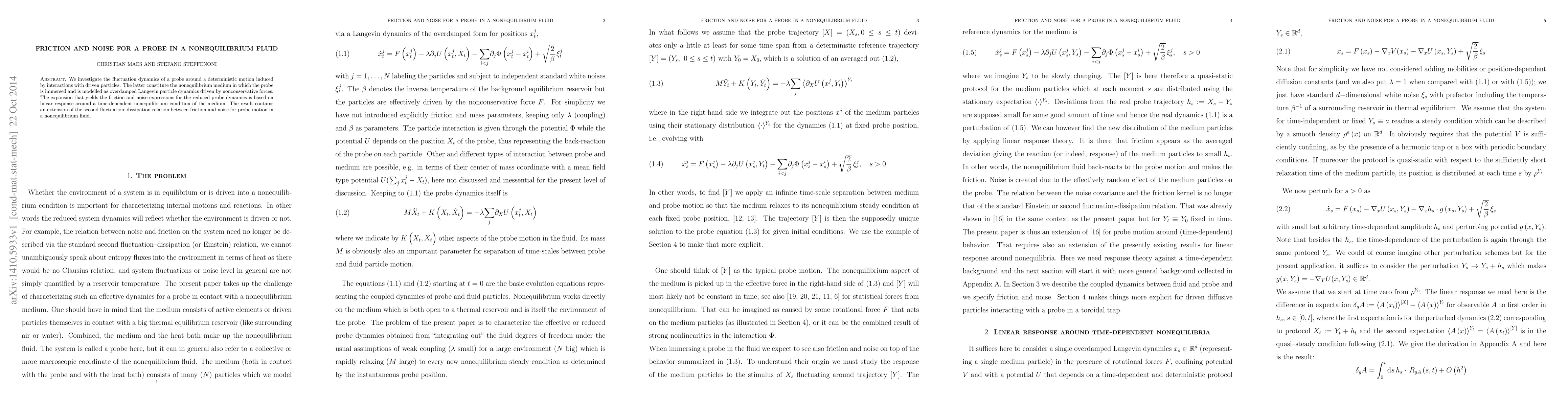 This paper explores the dynamics of a probe in a nonequilibrium fluid driven by interactions with other particles, using overdamped Langevin dynamics. It extends the fluctuation-dissipation theorem to derive expressions for friction and noise, revealing a second-order relationship between them in nonequilibrium conditions.