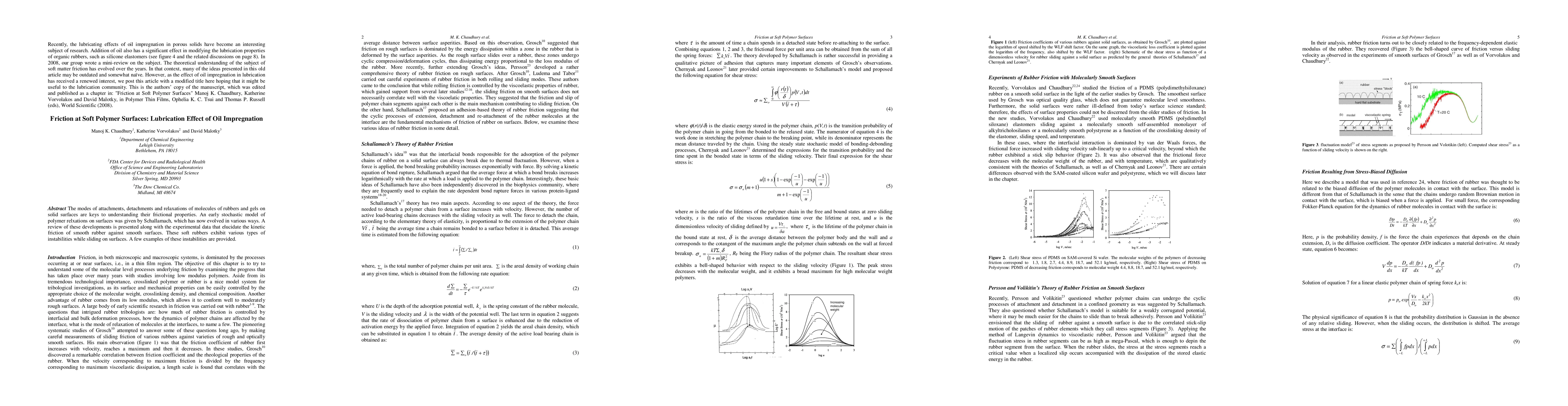 This paper reviews the evolution of models explaining frictional properties of soft polymers, focusing on rubber and gel interactions with surfaces. It highlights experimental data on kinetic friction and discusses instabilities observed during sliding, emphasizing the lubrication effect of oil impregnation.