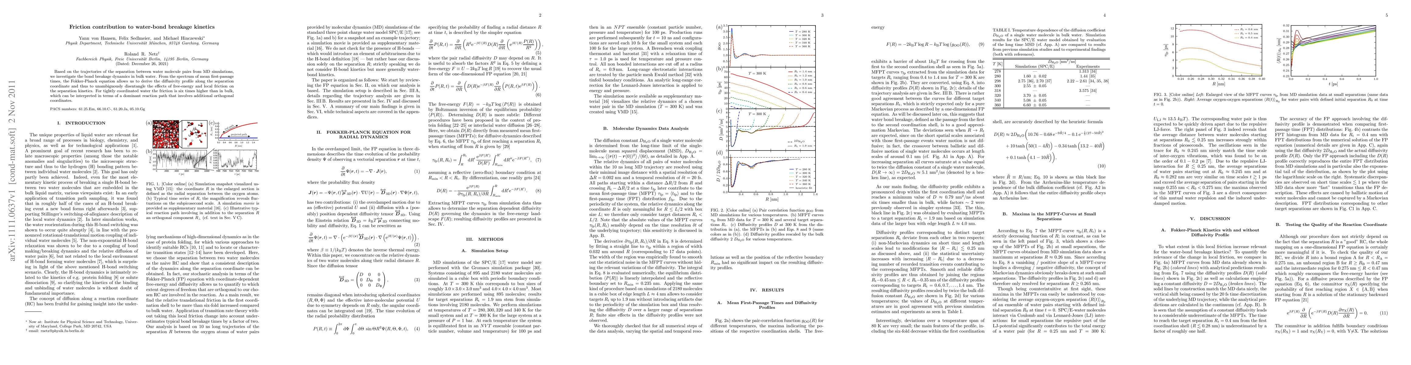 Based on the trajectories of the separation between water molecule pairs from MD simulations, we investigate the bond breakage dynamics in bulk water. From the spectrum of mean first-passage times, the Fokker-Planck equation allows us to derive the diffusivity profile along the separation coordinate and thus to unambiguously disentangle the effects of free-energy and local friction on the separation kinetics. For tightly coordinated water the friction is six times higher than in bulk, which can be interpreted in terms of a dominant reaction path that involves additional orthogonal coordinates.