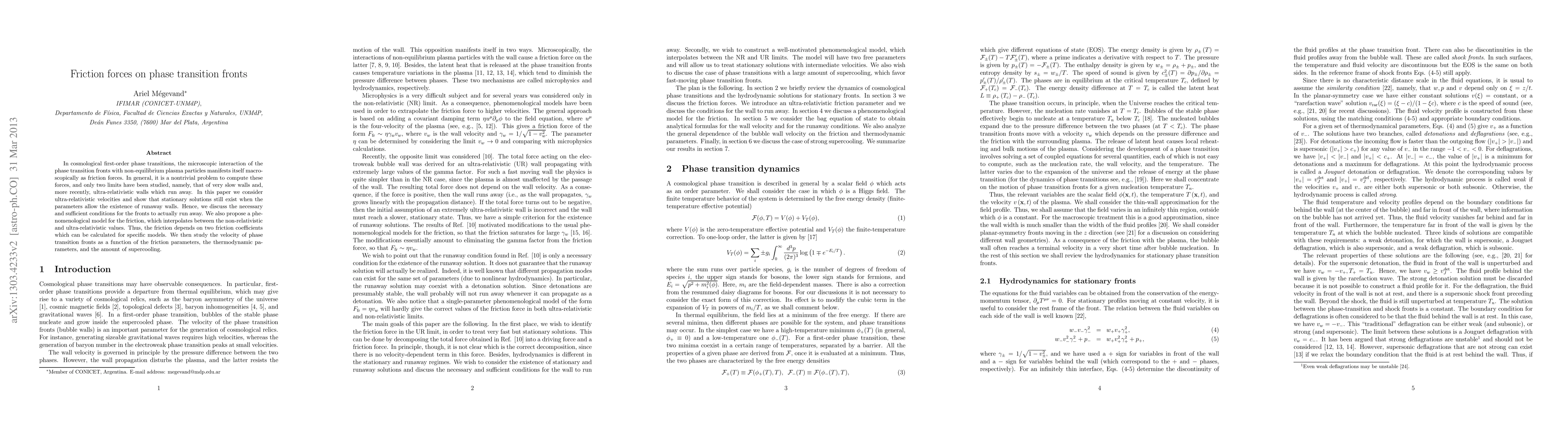 This paper investigates friction forces on phase transition fronts in cosmological first-order phase transitions, proposing a phenomenological model that interpolates between non-relativistic and ultra-relativistic regimes. It finds that stationary solutions exist under certain conditions, and analyzes the friction dependence on specific friction coefficients, thermodynamic parameters, and supercooling levels.