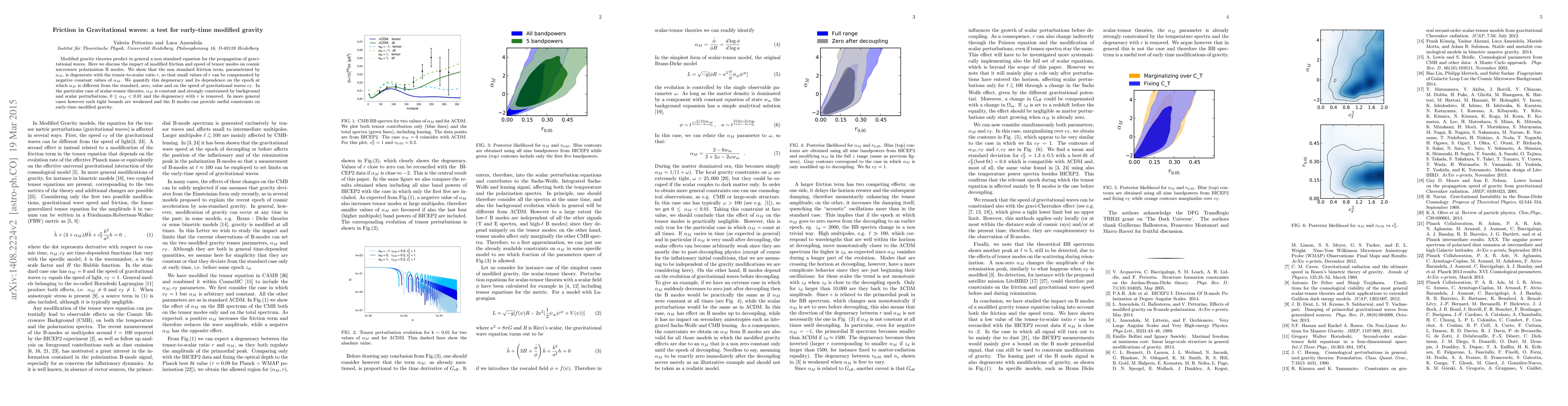 This paper investigates how modified gravity theories affect the propagation of gravitational waves, focusing on the friction term $\alpha_{M}$ and its impact on cosmic microwave polarization B modes. The study finds a degeneracy between the friction term and the tensor-to-scalar ratio $r$, which complicates the detection of early-time modified gravity effects.