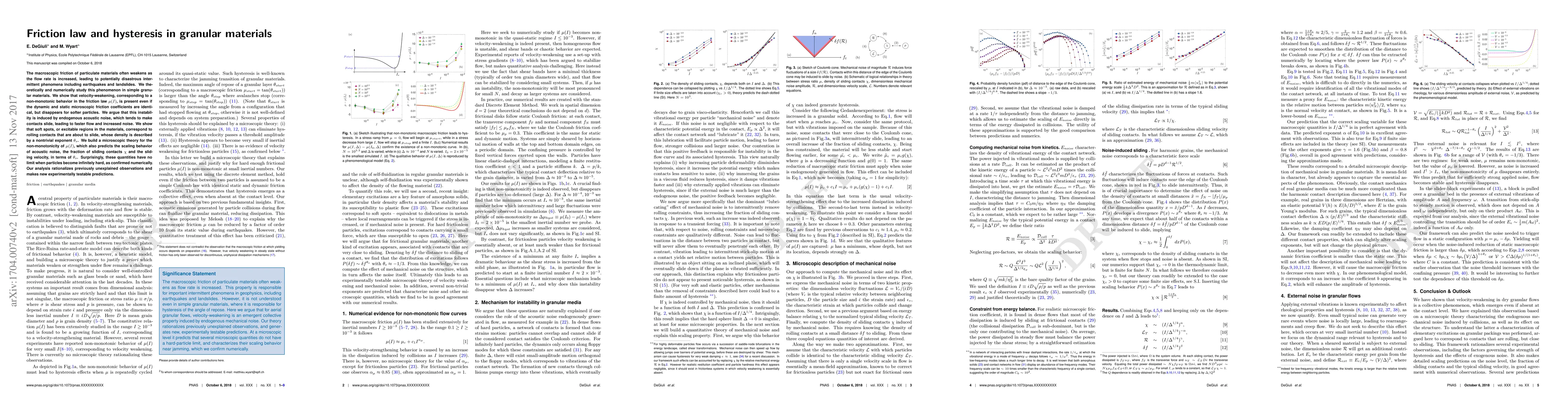 This paper explores the friction law and hysteresis in granular materials, demonstrating that velocity-weakening occurs due to endogenous acoustic noise, leading to non-monotonic friction behavior. The study reveals that this phenomenon persists even with identical dynamic and static friction coefficients, but vanishes for softer particles.