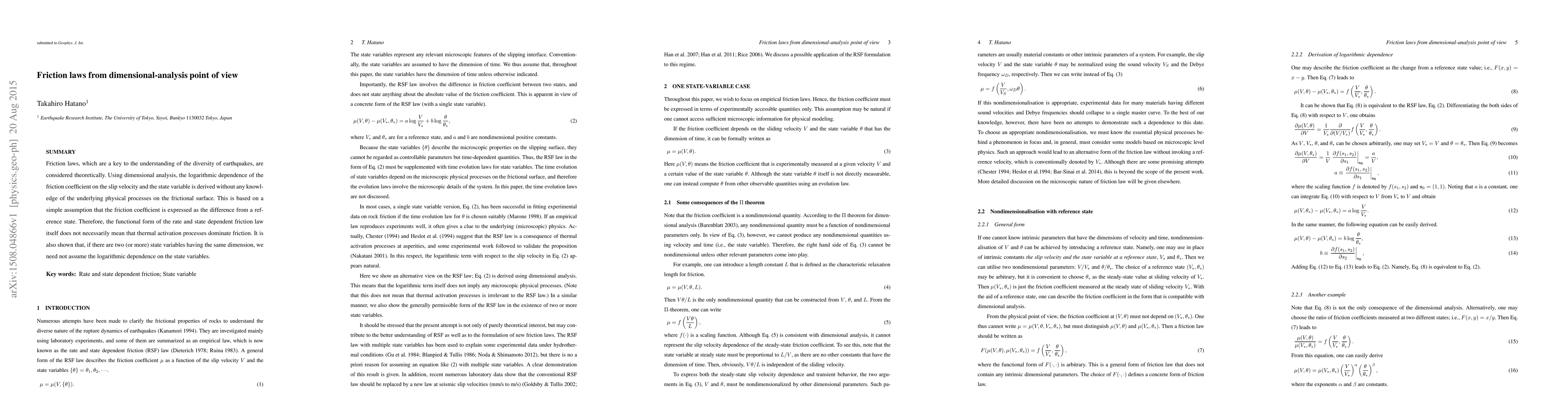 This paper derives friction laws using dimensional analysis, showing a logarithmic dependence of the friction coefficient on slip velocity and state variables without requiring knowledge of the underlying physical processes. It concludes that the functional form does not imply thermal activation dominance, and multiple state variables can exist without logarithmic dependence.
