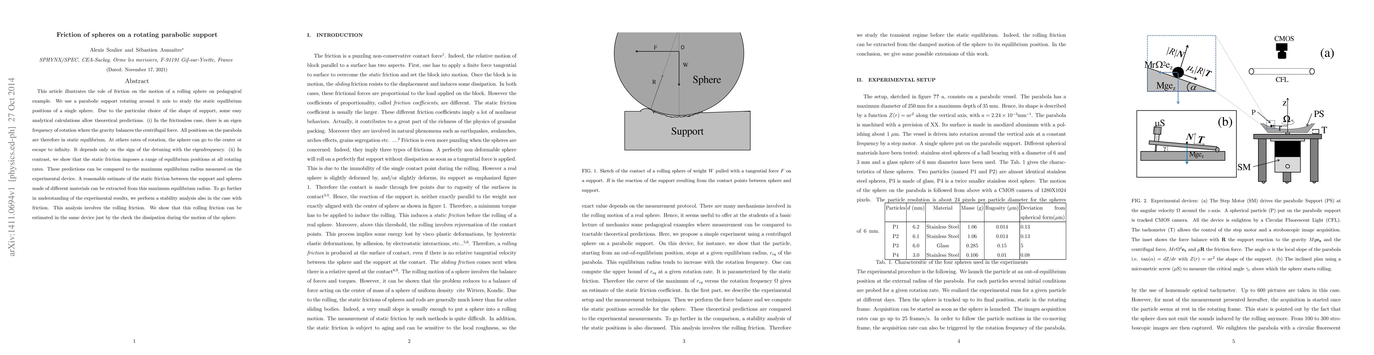 This article illustrates the role of friction on the motion of a rolling sphere on pedagogical example. We use a parabolic support rotating around it axis to study the static equilibrium positions of a single sphere. Due to the particular choice of the shape of support, some easy analytical calculations allow theoretical predictions. (i) In the frictionless case, there is an eigen frequency of rotation where the gravity balances the centrifugal force. All positions on the parabola are therefore in static equilibrium. At others rates of rotation, the sphere can go to the center or escape to infinity. It depends only on the sign of the detuning with the eigenfrequency. (ii) In contrast, we show that the static friction imposes a range of equilibrium positions at all rotating rates. These predictions can be compared to the maximum equilibrium radius measured on the experimental device. A reasonable estimate of the static friction between the support and spheres made of different materials can be extracted from this maximum equilibrium radius. To go further in understanding of the experimental results, we perform a stability analysis also in the case with friction. This analysis involves the rolling friction. We show that this rolling friction can be estimated in the same device just by the check the dissipation during the motion of the sphere.