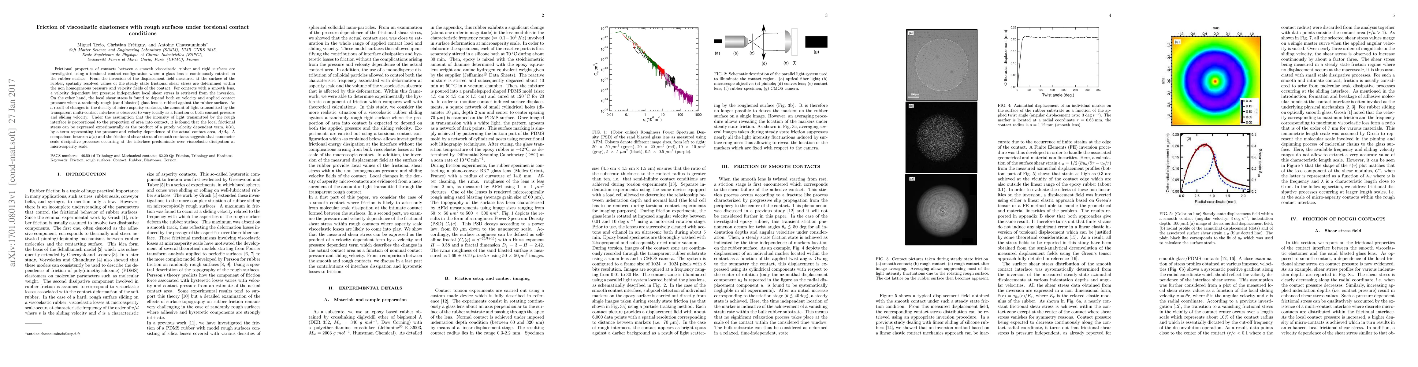 This paper investigates frictional properties between viscoelastic rubber and rough surfaces under torsional contact, finding that local shear stress depends on both velocity and contact pressure due to micro-asperity interactions. The frictional stress is modeled as a product of a velocity-dependent term and a term representing contact area, indicating nanoscale dissipative processes dominate over micro-asperity viscoelastic effects.