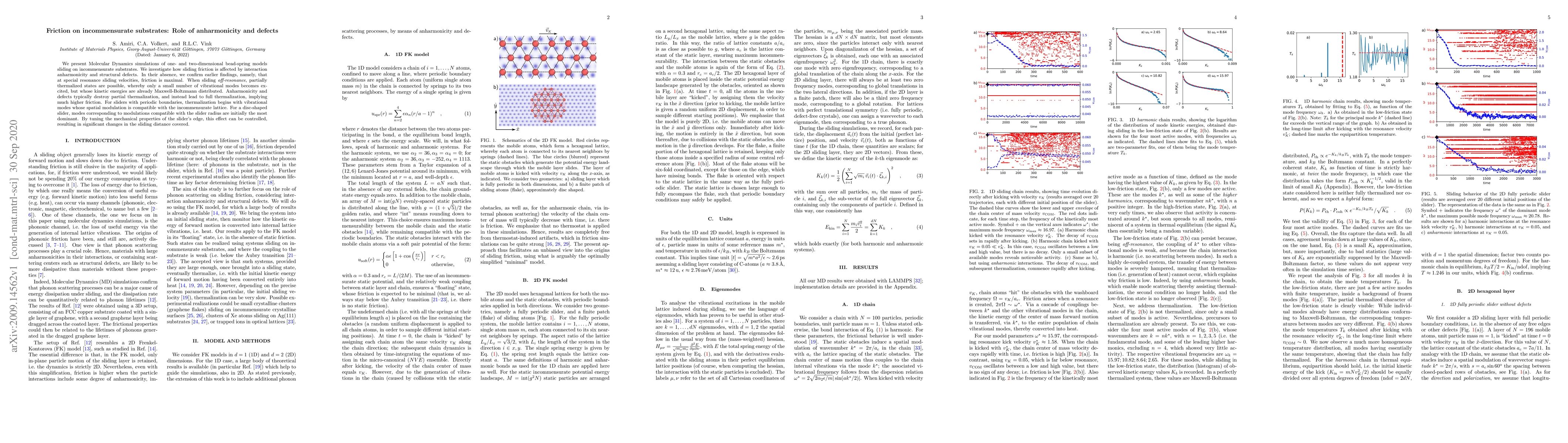 We present Molecular Dynamics simulations of one- and two-dimensional bead-spring models sliding on incommensurate substrates. We investigate how sliding friction is affected by interaction anharmonicity and structural defects. In their absence, we confirm earlier findings, namely, that at special resonance sliding velocities, friction is maximal. When sliding off-resonance, partially thermalized states are possible, whereby only a small number of vibrational modes becomes excited, but whose kinetic energies are already Maxwell-Boltzmann distributed. Anharmonicity and defects typically destroy partial thermalization, and instead lead to full thermalization, implying much higher friction. For sliders with periodic boundaries, thermalization begins with vibrational modes whose spatial modulation is compatible with the incommensurate lattice. For a disc-shaped slider, modes corresponding to modulations compatible with the slider radius are initially the most dominant. By tuning the mechanical properties of the slider's edge, this effect can be controlled, resulting in significant changes in the sliding distance covered.