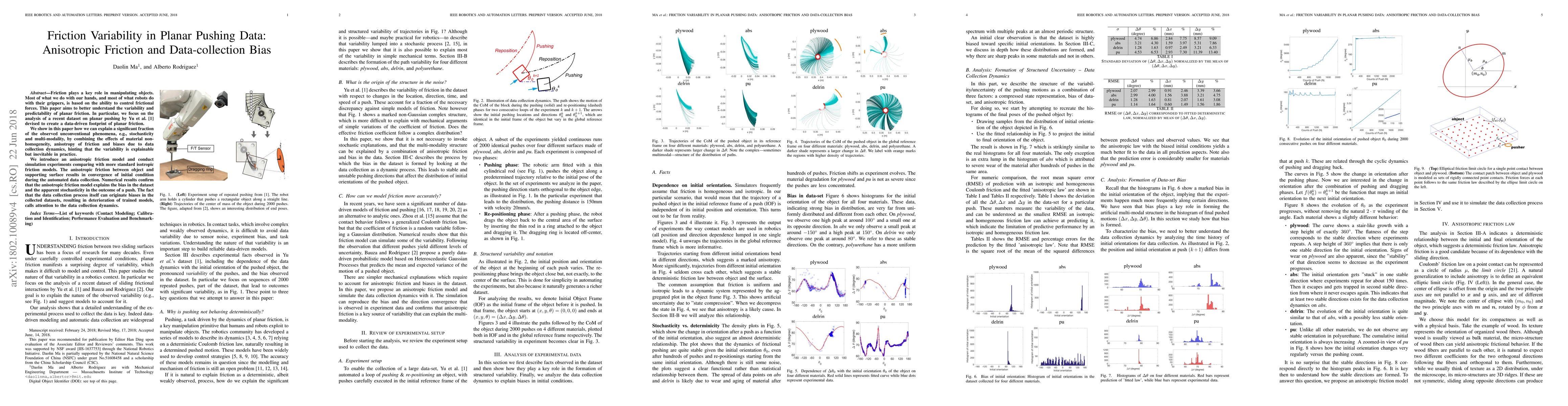 Friction plays a key role in manipulating objects. Most of what we do with our hands, and most of what robots do with their grippers, is based on the ability to control frictional forces. This paper aims to better understand the variability and predictability of planar friction. In particular, we focus on the analysis of a recent dataset on planar pushing by Yu et al. [1] devised to create a data-driven footprint of planar friction. We show in this paper how we can explain a significant fraction of the observed unconventional phenomena, e.g., stochasticity and multi-modality, by combining the effects of material non-homogeneity, anisotropy of friction and biases due to data collection dynamics, hinting that the variability is explainable but inevitable in practice. We introduce an anisotropic friction model and conduct simulation experiments comparing with more standard isotropic friction models. The anisotropic friction between object and supporting surface results in convergence of initial condition during the automated data collection. Numerical results confirm that the anisotropic friction model explains the bias in the dataset and the apparent stochasticity in the outcome of a push. The fact that the data collection process itself can originate biases in the collected datasets, resulting in deterioration of trained models, calls attention to the data collection dynamics.