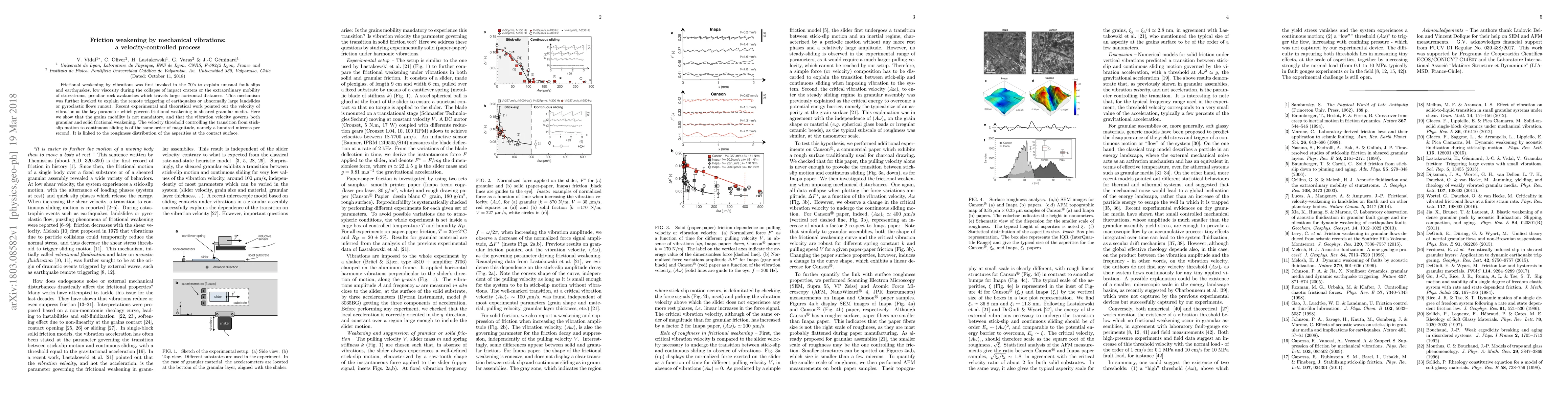 Summary: This research demonstrates that frictional weakening in both granular and solid materials can be governed by the velocity of mechanical vibrations, without requiring grain mobility, and identifies a velocity threshold of around a hundred microns per second that affects the transition from stick-slip to continuous sliding, correlating with surface roughness distribution.