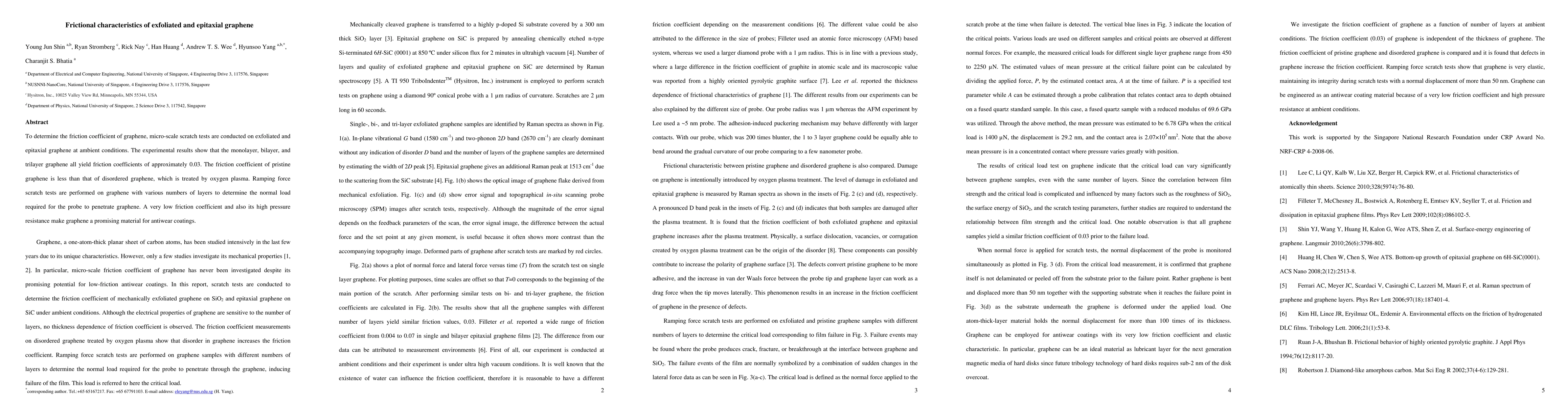 This study investigates the friction coefficients of exfoliated and epitaxial graphene through micro-scale scratch tests, finding that monolayer, bilayer, and trilayer graphene all exhibit a friction coefficient of around 0.03. Pristine graphene shows lower friction than disordered graphene treated with oxygen plasma, highlighting graphene's potential as an effective antiwear coating material.