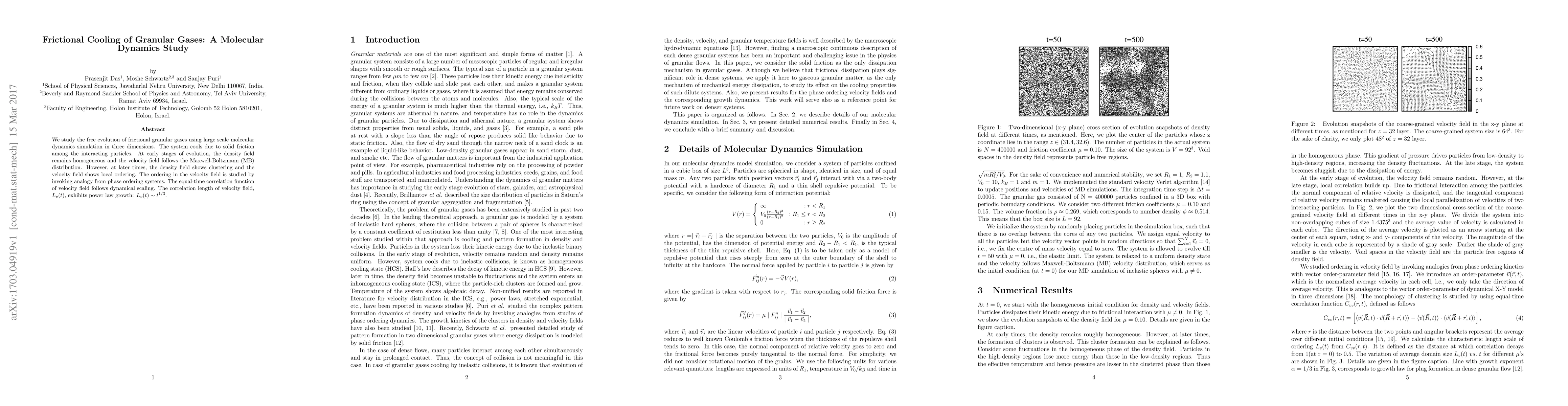This paper uses molecular dynamics simulations to explore the cooling dynamics of frictional granular gases, revealing that while early stages maintain homogeneity and Maxwell-Boltzmann distribution, later stages exhibit density clustering and velocity field ordering, with a correlation length scaling as $L_v(t)\sim t^{1/3}$.