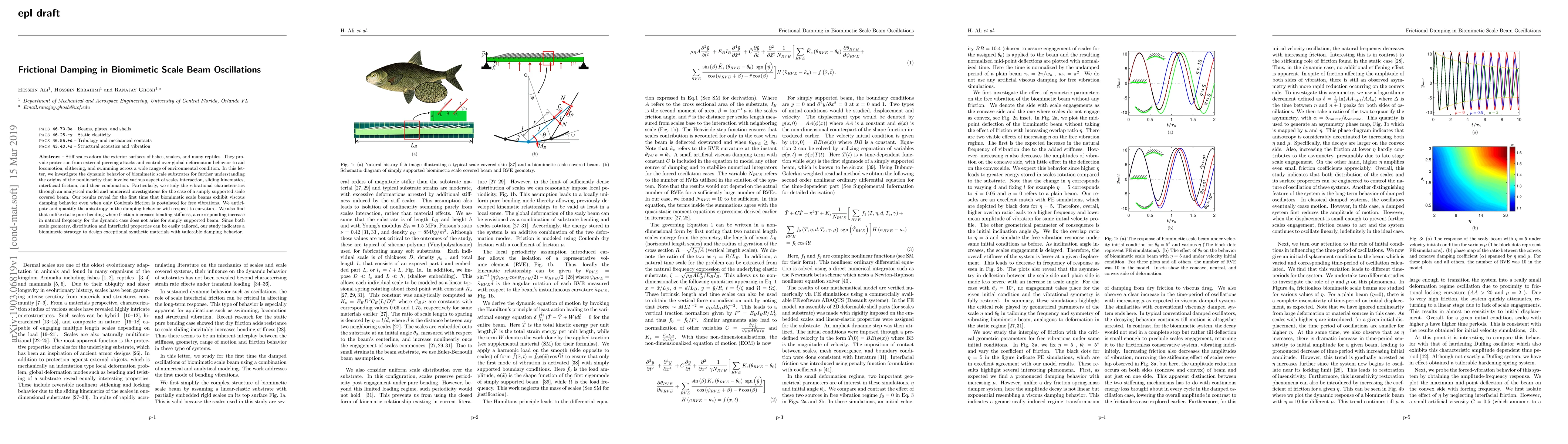 This paper investigates the dynamic behavior of biomimetic scale beams, revealing that they exhibit viscous damping due to friction, even in the absence of traditional damping mechanisms. The study highlights the anisotropy in damping behavior and suggests a biomimetic approach to designing synthetic materials with tailored damping properties.