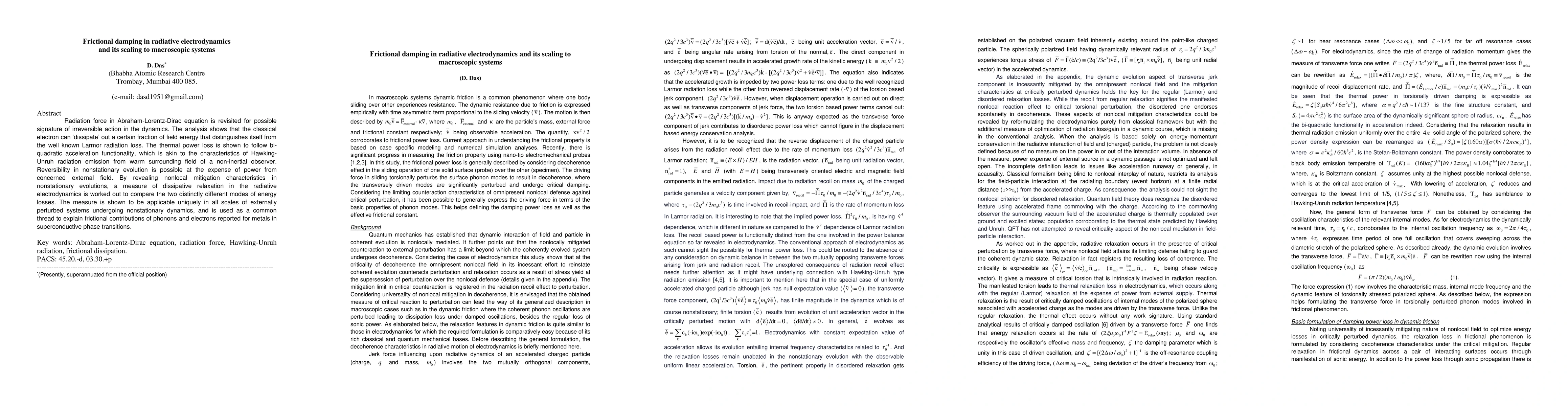 Radiation force in Abraham-Lorentz-Dirac equation is revisited for possible signature of irreversible action in the dynamics. The analysis shows that the classical electron can dissipate out a certain fraction of field energy that distinguishes itself from the well known Larmor radiation loss. The thermal power loss is shown to follow bi-quadratic acceleration functionality, which is akin to the characteristics of Hawking-Unruh radiation emission from warm surrounding field of a non-inertial observer. Reversibility in nonstationary evolution is possible at the expense of power from concerned external field. By revealing nonlocal mitigation characteristics in nonstationary evolutions, a measure of dissipative relaxation in the radiative electrodynamics is worked out to compare the two distinctly different modes of energy losses. The measure is shown to be applicable uniquely in all scales of externally perturbed systems undergoing nonstationary dynamics, and is used as a common thread to explain frictional contributions of phonons and electrons reported for metals in superconductive phase transitions. Key words: Abraham-Lorentz-Dirac equation, radiation force, Hawking-Unruh radiation, frictional dissipation.