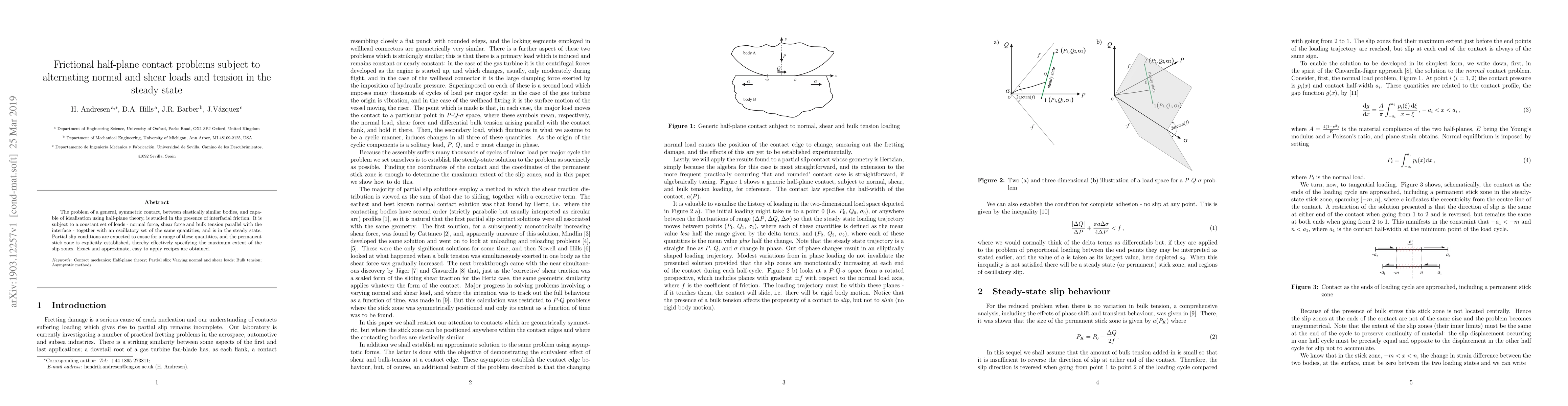 A research paper studies contact problems between elastically similar bodies with interfacial friction under constant and oscillatory loads, finding a permanent stick zone that specifies the maximum extent of slip zones.