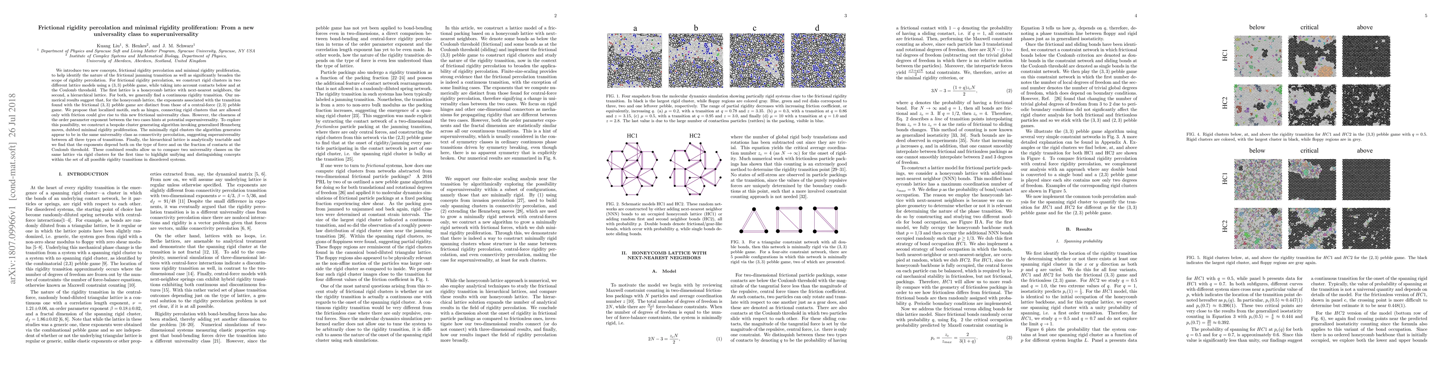We introduce two new concepts, frictional rigidity percolation and minimal rigidity proliferation, to help identify the nature of the frictional jamming transition as well as significantly broaden the scope of rigidity percolation. For frictional rigidity percolation, we construct rigid clusters in two different lattice models using a $(3,3)$ pebble game, while taking into account contacts below and at the Coulomb threshold. The first lattice is a honeycomb lattice with next-nearest neighbors, the second, a hierarchical lattice. For both, we generally find a continuous rigidity transition. Our numerical results suggest that, for the honeycomb lattice, the exponents associated with the transition found with the frictional $(3,3)$ pebble game are distinct from those of a central-force $(2,3)$ pebble game. We propose that localized motifs, such as hinges, connecting rigid clusters that are allowed only with friction could give rise to this new frictional universality class. However, the closeness of the order parameter exponent between the two cases hints at potential superuniversality. To explore this possibility, we construct a bespoke cluster generating algorithm invoking generalized Henneberg moves, dubbed minimal rigidity proliferation. The minimally rigid clusters the algorithm generates appear to be in the same universality class as connectivity percolation, suggesting superuniversality between all three types of transitions. Finally, the hierarchical lattice is analytically tractable and we find that the exponents depend both on the type of force and on the fraction of contacts at the Coulomb threshold. These combined results allow us to compare two universality classes on the same lattice via rigid clusters for the first time to highlight unifying and distinguishing concepts within the set of all possible rigidity transitions in disordered systems.