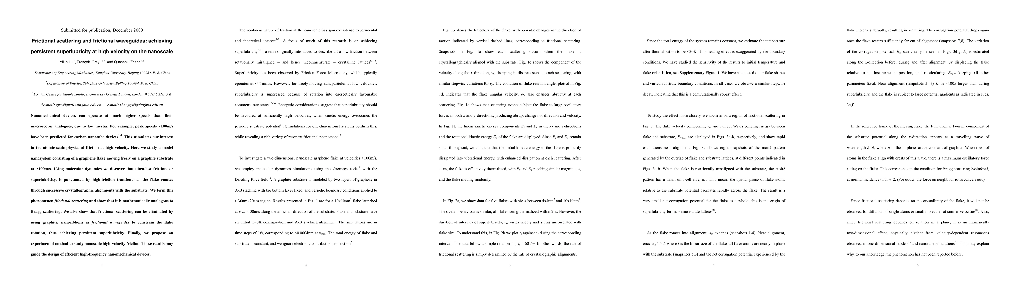Nanomechanical devices can operate at much higher speeds than their macroscopic analogues, due to low inertia. For example, peak speeds >100m/s have been predicted for carbon nanotube devices. This stimulates our interest in the atomic-scale physics of friction at high velocity. Here we study a model nanosystem consisting of a graphene flake moving freely on a graphite substrate at >100m/s. Using molecular dynamics we discover that ultra-low friction, or superlubricity, is punctuated by high-friction transients as the flake rotates through successive crystallographic alignments with the substrate. We term this phenomenon frictional scattering and show that it is mathematically analogous to Bragg scattering. We also show that frictional scattering can be eliminated by using graphitic nanoribbons as frictional waveguides to constrain the flake rotation, thus achieving persistent superlubricity. Finally, we propose an experimental method to study nanoscale high-velocity friction. These results may guide the design of efficient high-frequency nanomechanical devices.