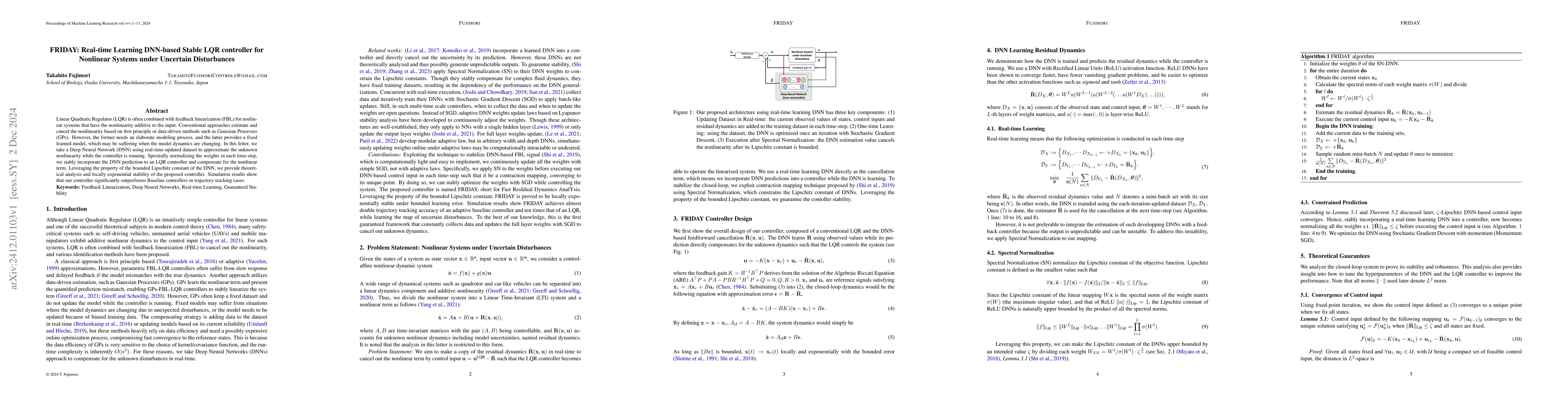 This paper proposes a real-time learning DNN-based LQR controller for nonlinear systems facing uncertain disturbances. It uses a DNN updated in real time to approximate unknown nonlinearities, stabilizing the controller with spectrally normalized weights and demonstrating theoretical stability and superior performance in simulations compared to baseline controllers.
