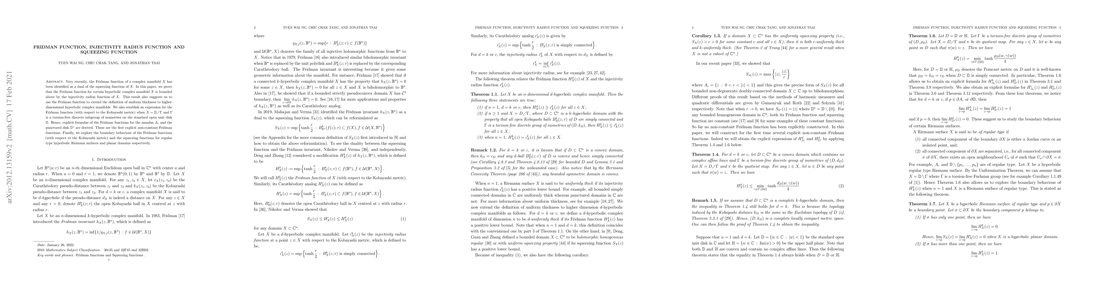 The paper introduces a novel approach to bounding the Fridman function by the injectivity radius function and extends the concept of uniform thickness using the Fridman function, providing explicit formulae for annulus and punctured disk cases.