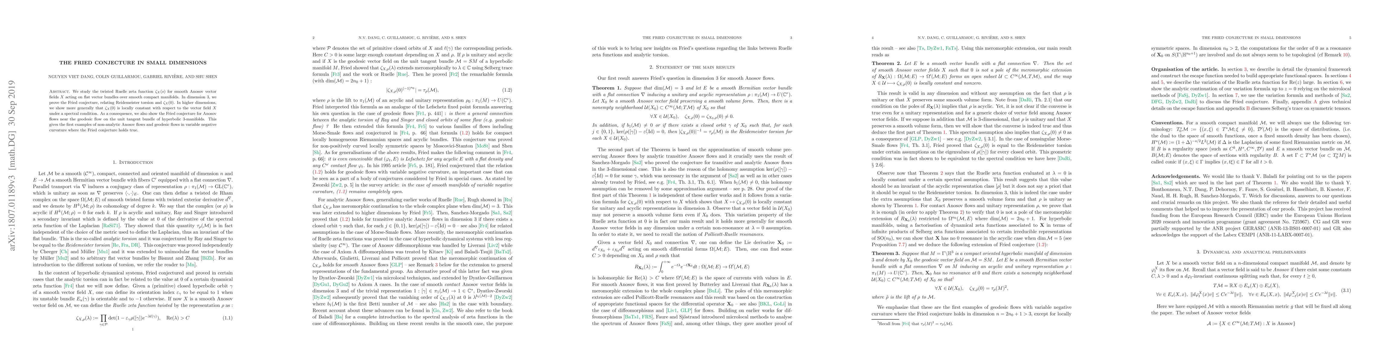 The paper proves Fried conjecture in dimension 3 for smooth Anosov vector fields, relating Reidemeister torsion to the twisted Ruelle zeta function at $s=0$. In higher dimensions, it shows $\zeta_X(0)$ is locally constant under a spectral condition, extending Fried conjecture to Anosov flows near geodesic flows on hyperbolic 3-manifolds.