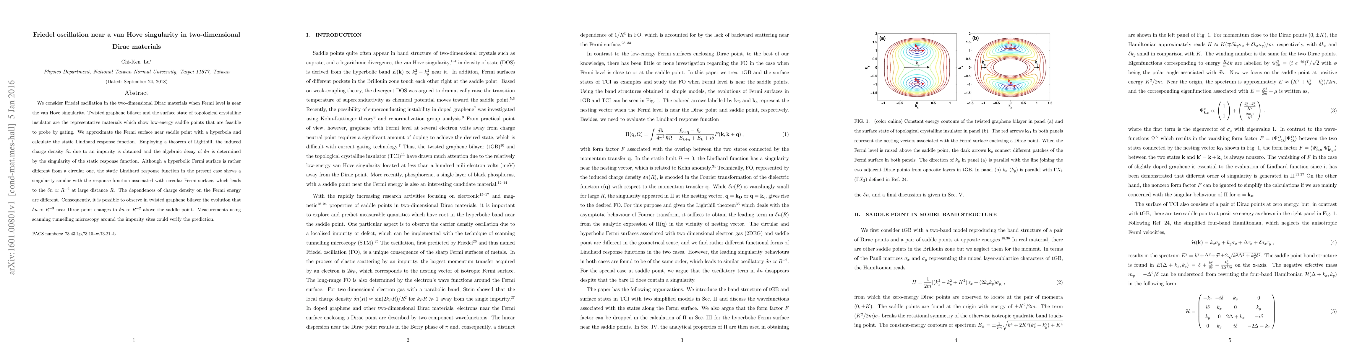 We consider Friedel oscillation in the two-dimensional Dirac materials when Fermi level is near the van Hove singularity. Twisted graphene bilayer and the surface state of topological crystalline insulator are the representative materials which show low-energy saddle points that are feasible to probe by gating. We approximate the Fermi surface near saddle point with a hyperbola and calculate the static Lindhard response function. Employing a theorem of Lighthill, the induced charge density $\delta n$ due to an impurity is obtained and the algebraic decay of $\delta n$ is determined by the singularity of the static response function. Although a hyperbolic Fermi surface is rather different from a circular one, the static Lindhard response function in the present case shows a singularity similar with the response function associated with circular Fermi surface, which leads to the $\delta n\propto R^{-2}$ at large distance $R$. The dependences of charge density on the Fermi energy are different. Consequently, it is possible to observe in twisted graphene bilayer the evolution that $\delta n\propto R^{-3}$ near Dirac point changes to $\delta n\propto R^{-2}$ above the saddle point. Measurements using scanning tunnelling microscopy around the impurity sites could verify the prediction.