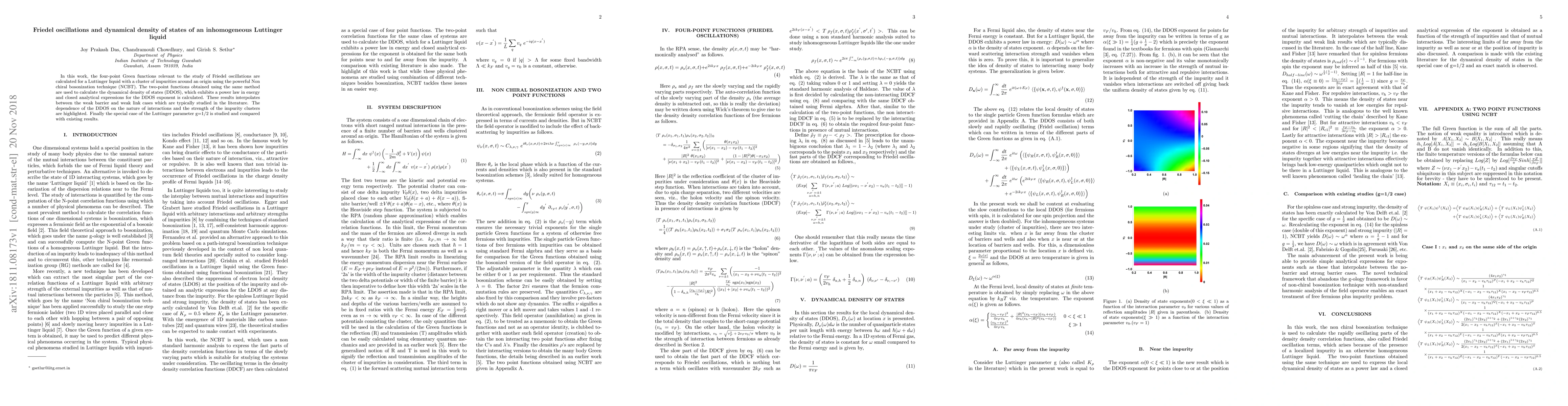 In this work, the four-point Green functions relevant to the study of Friedel oscillations are calculated for a Luttinger liquid with a cluster of impurities around an origin using the powerful Non chiral bosonization technique (NCBT). The two-point functions obtained using the same method are used to calculate the dynamical density of states (DDOS), which exhibits a power law in energy and closed analytical expressions for the DDOS exponent is calculated. These results interpolates between the weak barrier and weak link cases which are typically studied in the literature. The dependence of the DDOS on the nature of interactions and the strength of the impurity clusters are highlighted. Finally the special case of the Luttinger parameter g=1/2 is studied and compared with existing results.