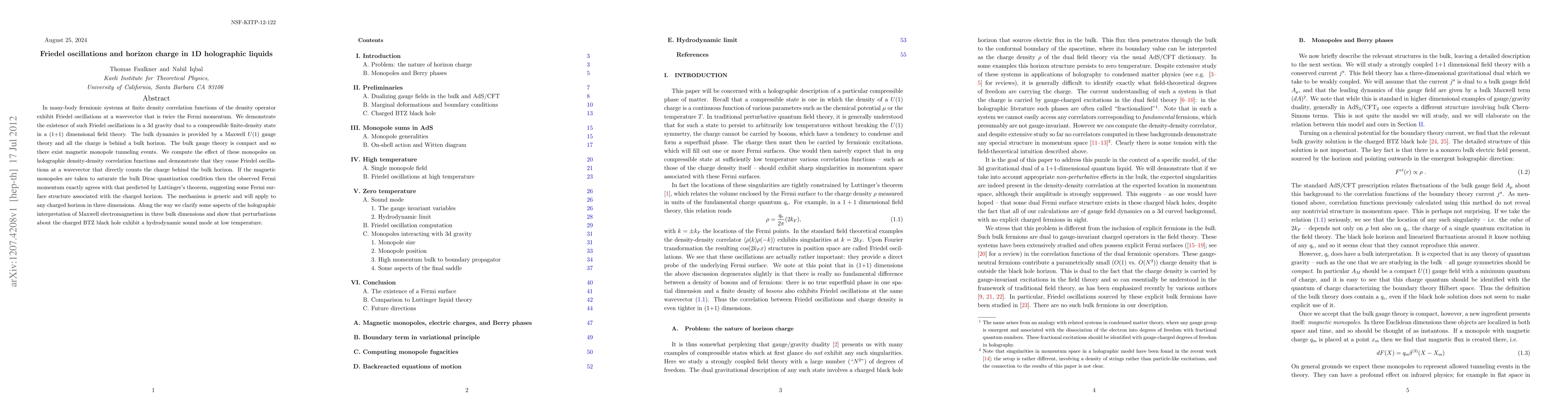 This paper demonstrates the existence of Friedel oscillations in a 1D holographic liquid, showing that magnetic monopole tunneling events in a 3D bulk gauge theory cause these oscillations, which count the charge behind the horizon. The findings suggest a Fermi surface structure associated with the charged horizon and apply to any such horizon in three dimensions.