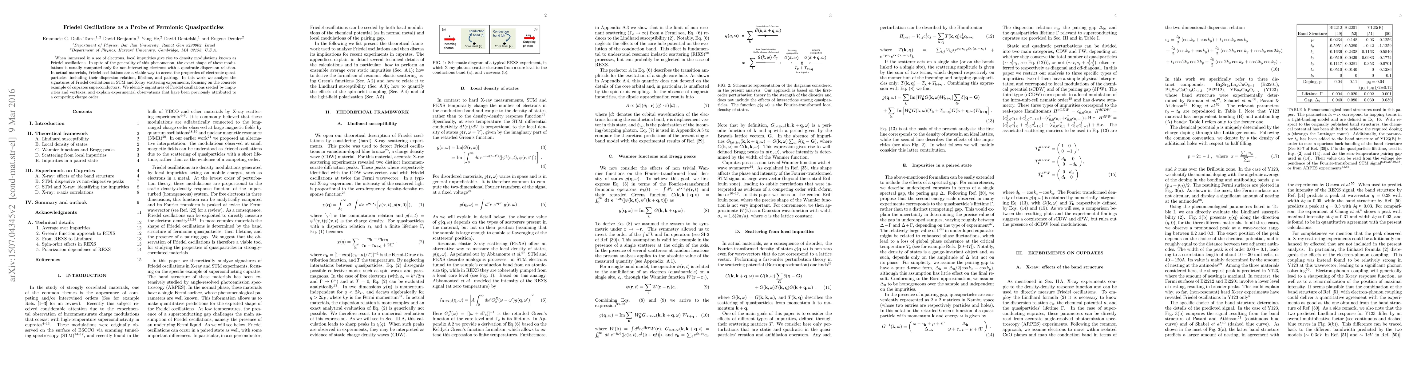 This paper investigates how Friedel oscillations, density modulations around local impurities in electron systems, reveal properties of fermionic quasiparticles in strongly-correlated materials, using cuprate superconductors as a case study. It highlights the influence of band structure, quasiparticle lifetime, and pairing gaps on these oscillations, comparing theoretical models with experimental data from STM and X-ray scattering.