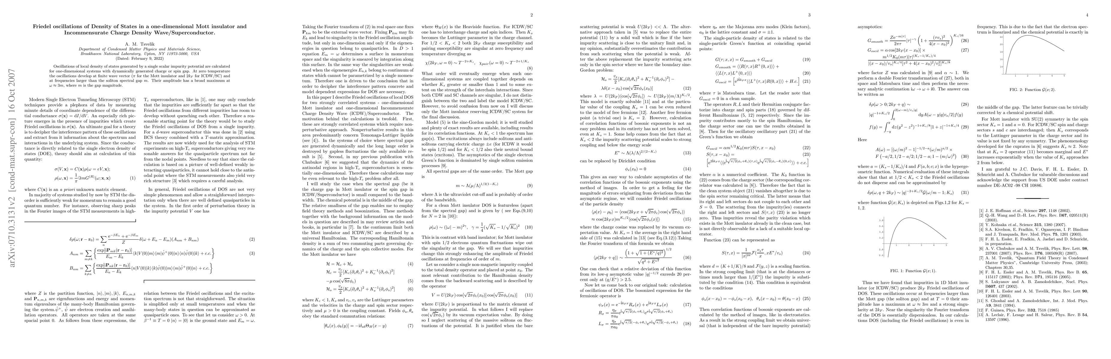 This paper investigates Friedel oscillations in the density of states for one-dimensional Mott insulators and incommensurate charge density wave/superconductor systems. It finds that oscillations develop at specific wave vectors and frequencies above the soliton spectral gap, with a peak amplitude near three times the gap magnitude.
