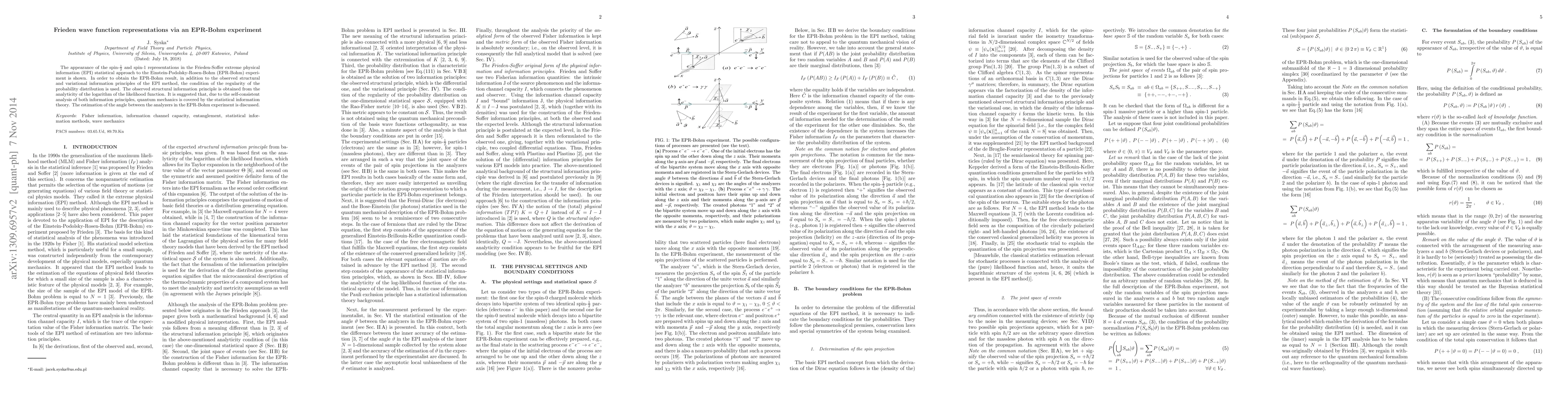 The appearance of the spin-1/2 and spin-1 representations in the Frieden-Soffer extreme physical information (EPI) statistical approach to the Einstein-Podolsky-Rosen-Bohm (EPR-Bohm) experiment is shown. In order to obtain the EPR-Bohm result, in addition to the observed structural and variational information principles of the EPI method, the condition of the regularity of the probability distribution is used. The observed structural information principle is obtained from the analyticity of the logarithm of the likelihood function. It is suggested that, due to the self-consistent analysis of both information principles, quantum mechanics is covered by the statistical information theory. The estimation of the angle between the analyzers in the EPR-Bohm experiment is discussed.
