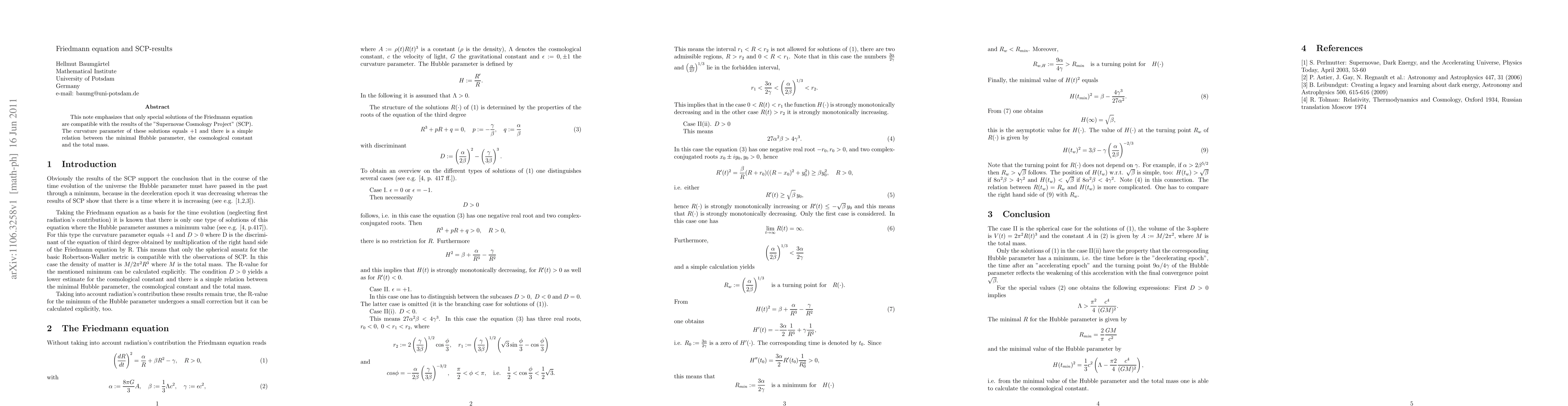 This paper argues that only specific solutions to the Friedmann equation align with SCP's findings on supernovae, characterized by a curvature parameter of +1, and establishes a straightforward relationship between the minimal Hubble parameter, the cosmological constant, and the total mass.