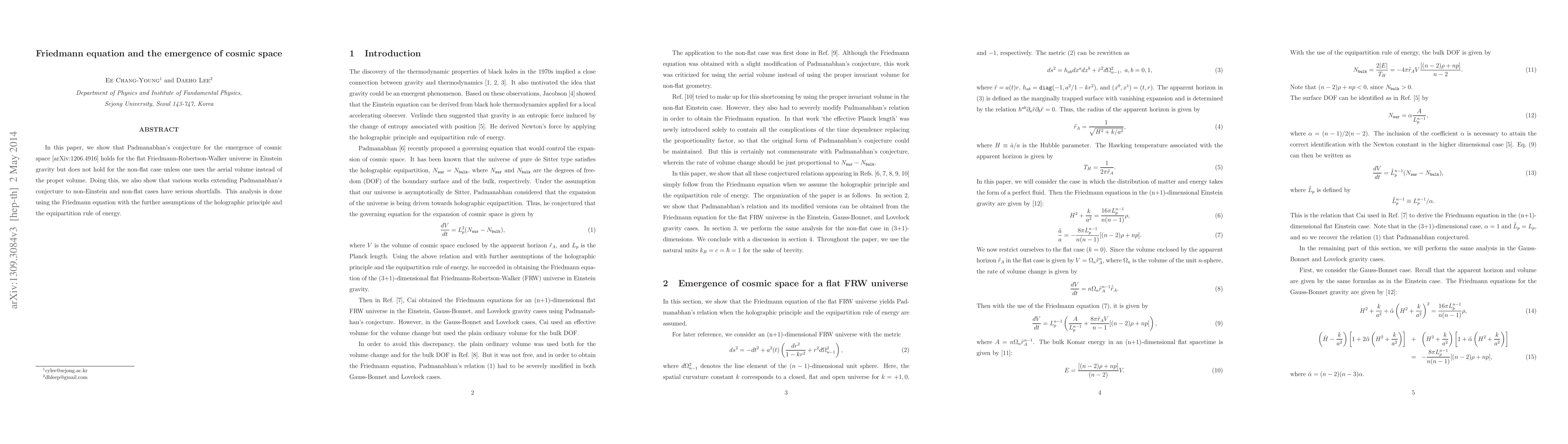 This paper confirms Padmanabhan's conjecture for the emergence of cosmic space in a flat Friedmann-Robertson-Walker universe, but finds it inapplicable for non-flat cases unless aerial volume is used. It critiques extensions of the conjecture to non-Einstein and non-flat scenarios, employing the Friedmann equation alongside the holographic principle and equipartition rule.