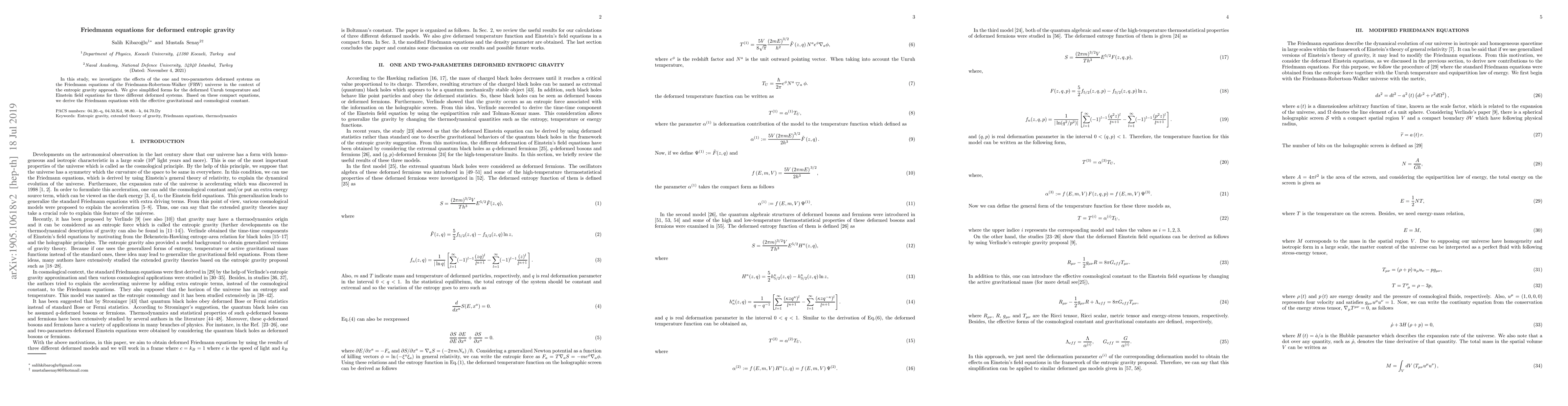 This paper explores how one and two-parameter deformations affect the Friedmann equations in the entropic gravity framework, deriving simplified forms for the deformed Unruh temperature and Einstein field equations, and ultimately obtaining the Friedmann equations with an effective gravitational and cosmological constant.