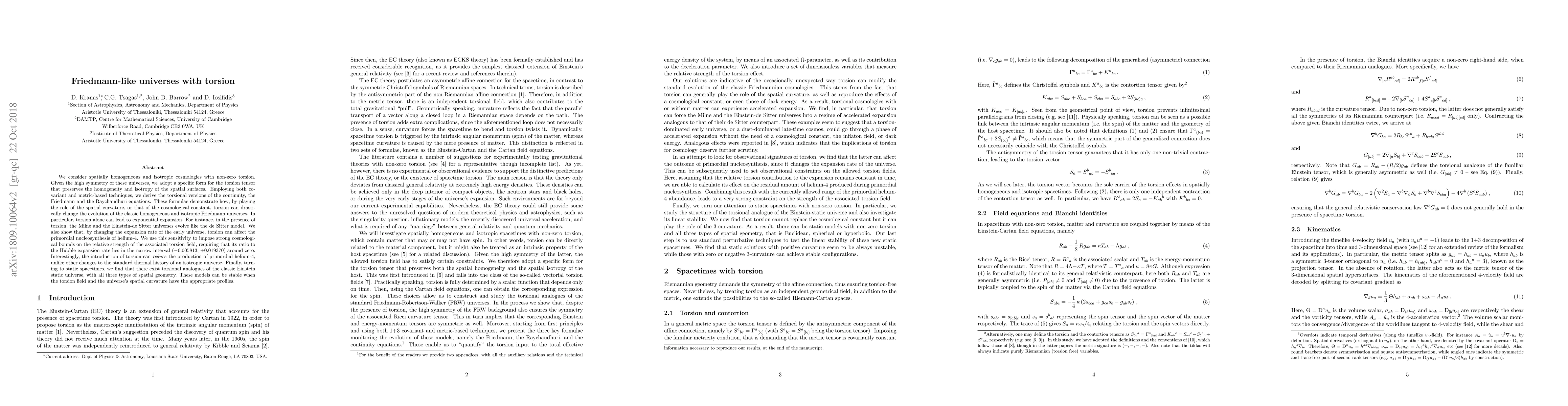 This paper explores Friedmann-like universes with torsion, deriving torsional versions of the Friedmann and Raychaudhuri equations. It shows that torsion can significantly alter the universe's expansion, potentially leading to exponential growth and affecting primordial nucleosynthesis, thereby imposing strict bounds on the torsion field's strength relative to the Hubble rate.