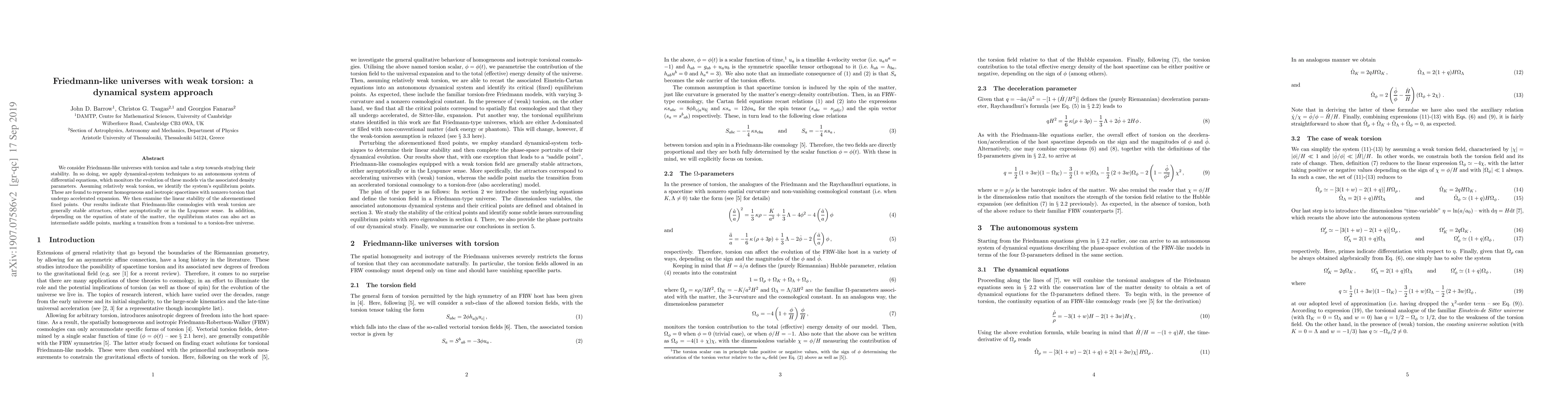 This research explores the stability of Friedmann-like universes with weak torsion using dynamical systems techniques. It identifies equilibrium points representing accelerated expanding spacetimes with nonzero torsion and finds these models to be generally stable, though they can also act as transitional saddle points depending on the matter's equation of state.