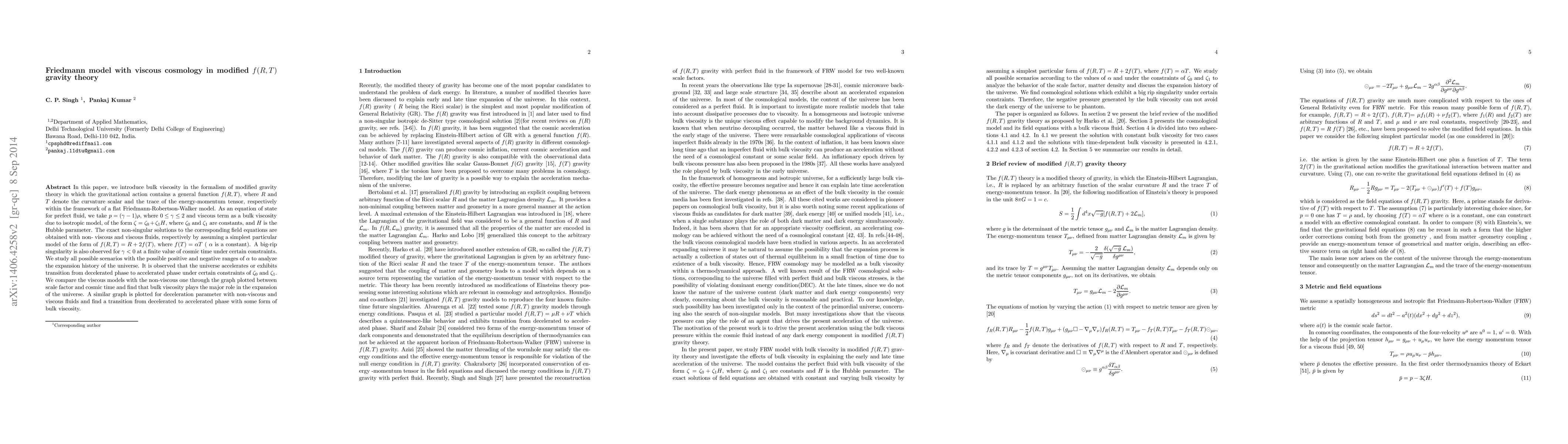 In this paper, we introduce bulk viscosity in the formalism of modified gravity theory in which the gravitational action contains a general function $f(R,T)$, where $R$ and $T$ denote the curvature scalar and the trace of the energy-momentum tensor, respectively within the framework of a flat Friedmann-Robertson-Walker model. As an equation of state for prefect fluid, we take $p=(\gamma-1)\rho$, where $0 \leq \gamma \leq 2$ and viscous term as a bulk viscosity due to isotropic model, of the form $\zeta =\zeta_{0}+\zeta_{1}H$, where $\zeta_{0}$ and $\zeta_{1}$ are constants, and $H$ is the Hubble parameter. The exact non-singular solutions to the corresponding field equations are obtained with non- viscous and viscous fluids, respectively by assuming a simplest particular model of the form of $f(R,T) = R+2f(T)$, where $f(T)=\alpha T$ ( $\alpha$ is a constant). A big-rip singularity is also observed for $\gamma<0$ at a finite value of cosmic time under certain constraints. We study all possible scenarios with the possible positive and negative ranges of $\alpha$ to analyze the expansion history of the universe. It is observed that the universe accelerates or exhibits transition from decelerated phase to accelerated phase under certain constraints of $\zeta_0$ and $\zeta_1$. We compare the viscous models with the non-viscous one through the graph plotted between scale factor and cosmic time and find that bulk viscosity plays the major role in the expansion of the universe. A similar graph is plotted for deceleration parameter with non-viscous and viscous fluids and find a transition from decelerated to accelerated phase with some form of bulk viscosity.
