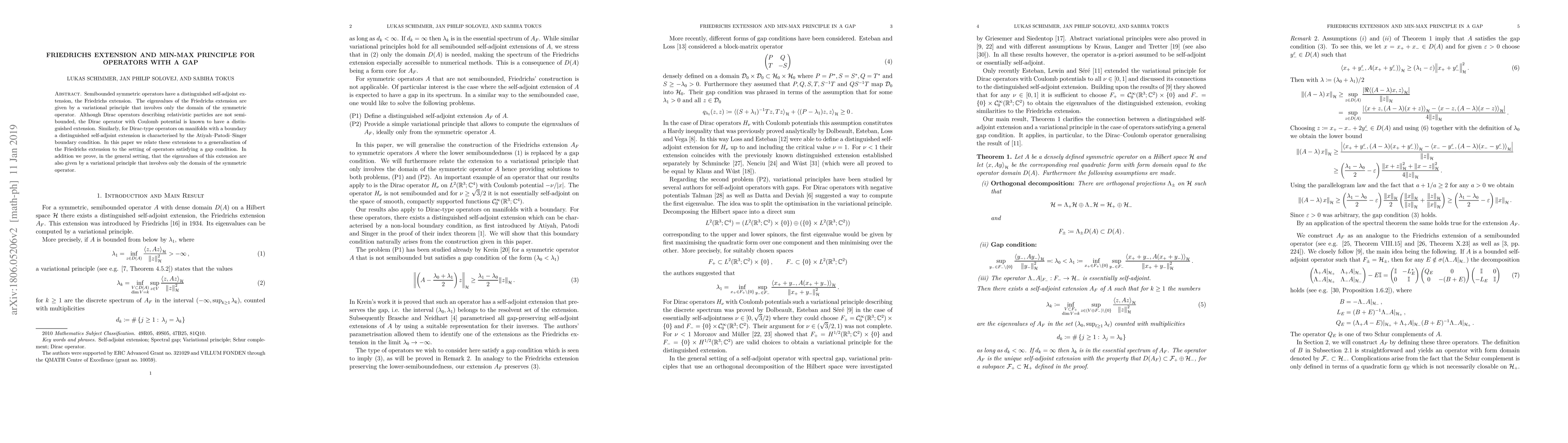 Semibounded symmetric operators have a distinguished self-adjoint extension, the Friedrichs extension. The eigenvalues of the Friedrichs extension are given by a variational principle that involves only the domain of the symmetric operator. Although Dirac operators describing relativistic particles are not semibounded, the Dirac operator with Coulomb potential is known to have a distinguished extension. Similarly, for Dirac-type operators on manifolds with a boundary a distinguished self-adjoint extension is characterised by the Atiyah--Patodi--Singer boundary condition. In this paper we relate these extensions to a generalisation of the Friedrichs extension to the setting of operators satisfying a gap condition. In addition we prove, in the general setting, that the eigenvalues of this extension are also given by a variational principle that involves only the domain of the symmetric operator.