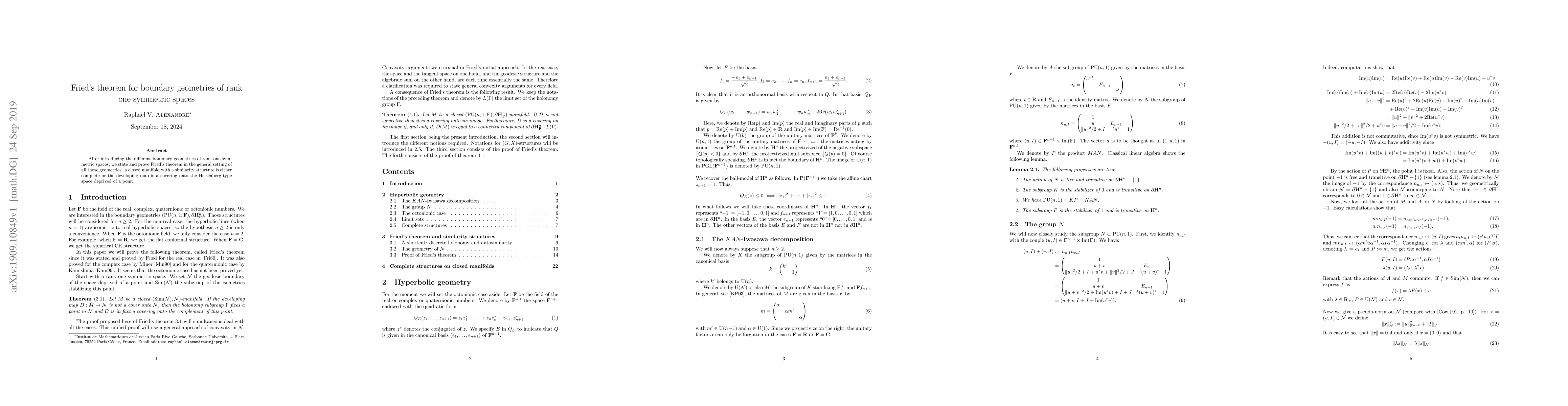 Fried's theorem is proven for various boundary geometries of rank one symmetric spaces, showing that a closed manifold with a similarity structure is either complete or its developing map covers the Heisenberg-type space minus a point.