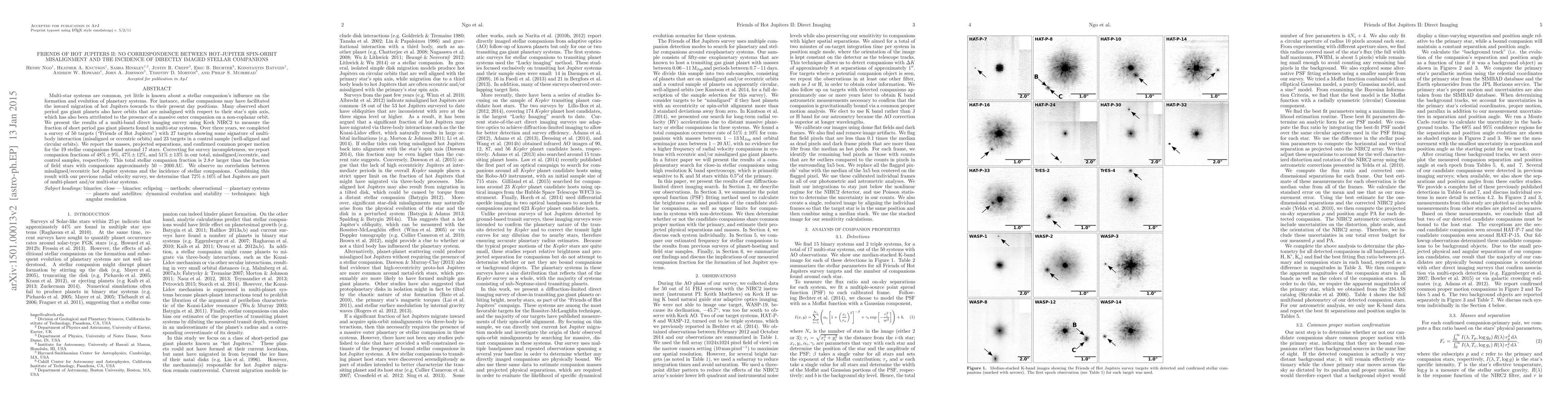 This study investigates the presence of stellar companions around hot Jupiters and finds no correlation between spin-orbit misalignment of these planets and the incidence of such companions. The survey detected stellar companions in 48% of hot Jupiter systems, significantly higher than the fraction in the general field population, but no direct link between companion presence and orbital misalignment was observed.