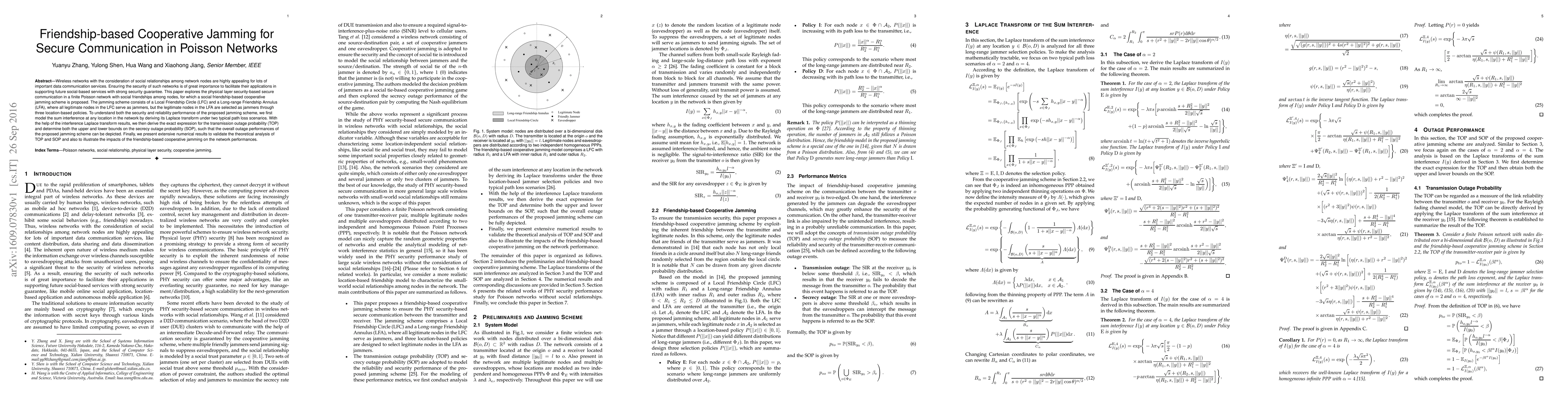 This paper proposes a social friendship-based cooperative jamming scheme for secure communication in Poisson networks, utilizing Local Friendship Circles and Long-range Friendship Annuli to enhance security. Theoretical analysis and numerical results demonstrate the scheme's impact on transmission and secrecy outage probabilities.