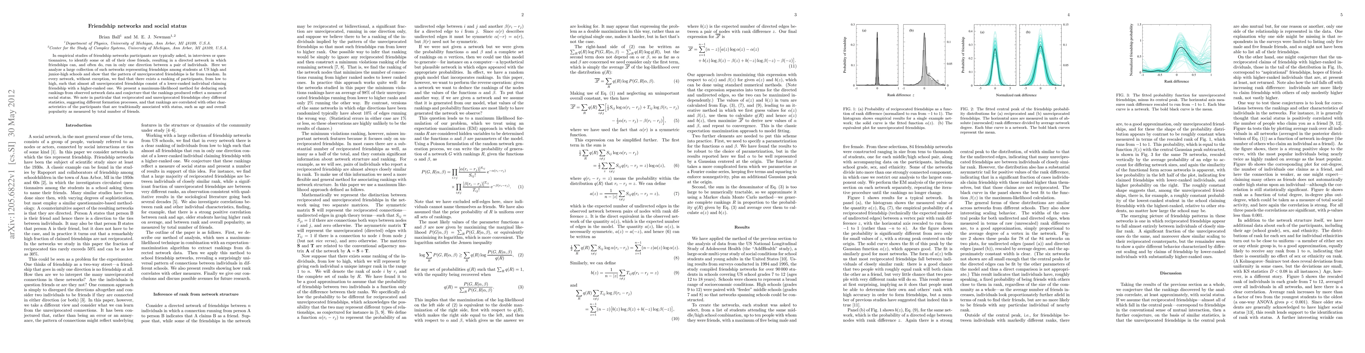 A study analyzing friendship networks among US high school students found that unreciprocated friendships often involve a lower-ranked individual claiming friendship with a higher-ranked one, suggesting a ranking of participants from low to high social status. The findings imply that social status is reflected in the network structure and are correlated with other characteristics associated with status.
