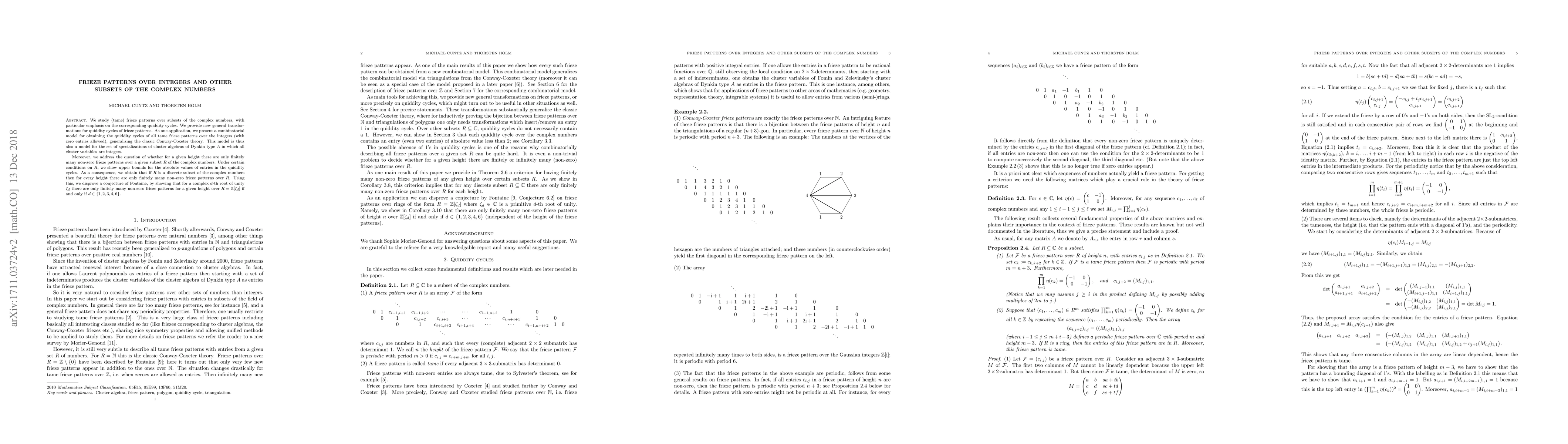 This paper explores tame frieze patterns over subsets of the complex numbers, focusing on quiddity cycles and introducing new transformations. It presents a combinatorial model for frieze patterns over integers, generalizing Conway-Coxeter theory, and disproves a conjecture by showing that only for specific values of $d$ are there finitely many non-zero frieze patterns over $\mathbb{Z}[\zeta_d]$.