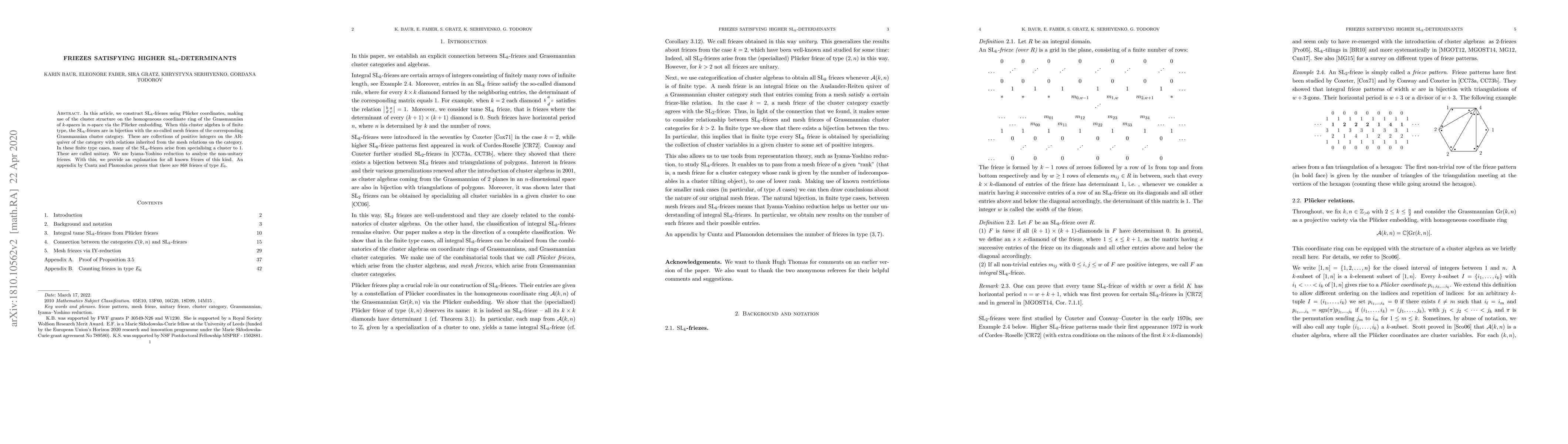 In this article, we construct SL$_k$-friezes using Pl\"ucker coordinates, making use of the cluster structure on the homogeneous coordinate ring of the Grassmannian of $k$-spaces in $n$-space via the Pl\"ucker embedding. When this cluster algebra is of finite type, the SL$_k$-friezes are in bijection with the so-called mesh friezes of the corresponding Grassmannian cluster category. These are collections of positive integers on the AR-quiver of the category with relations inherited from the mesh relations on the category. In these finite type cases, many of the SL$_k$-friezes arise from specialising a cluster to 1. These are called unitary. We use Iyama-Yoshino reduction to analyse the non-unitary friezes. With this, we provide an explanation for all known friezes of this kind. An appendix by Cuntz and Plamondon proves that there are 868 friezes of type $E_6$.
